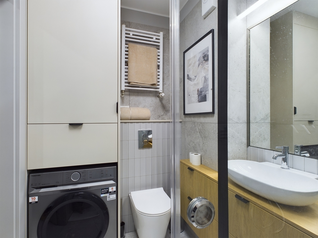 W łazience z dużą kabiną prysznicową, umywalką i toaleta znajduje się również pralka w zabudowie.