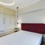 Sypialnia posiada duże łóżko oraz garderobę w zabudowie.