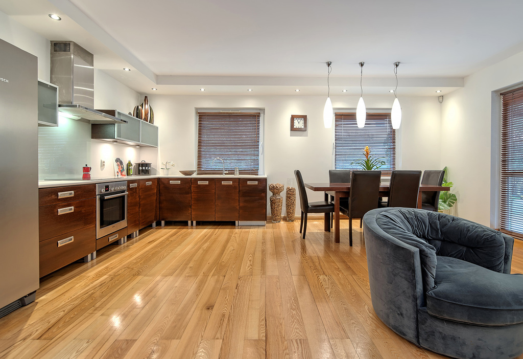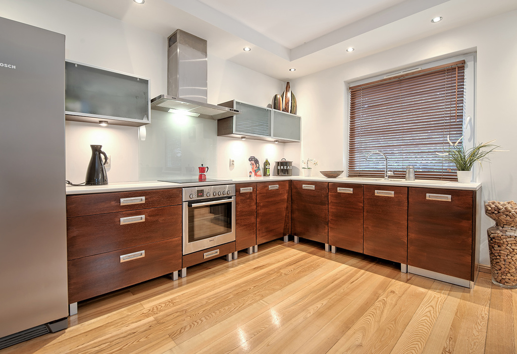 Aneks kuchenny zaopatrzony jest we wszelkie niezbędne sprzęty AGD takie jak: piekarnik (marki BOSCH), płyta elektryczna, zmywarka, lodówka dwudrzwiowa (marki Bosch) oraz okap kuchenny. Zamontowany został także granitowy zlew oraz bateria marki Grohe. Fronty zabudowy kuchennej zostały wykończone fornirem dębowym.