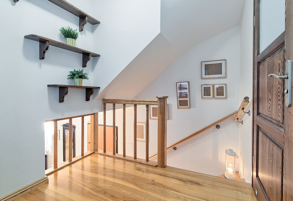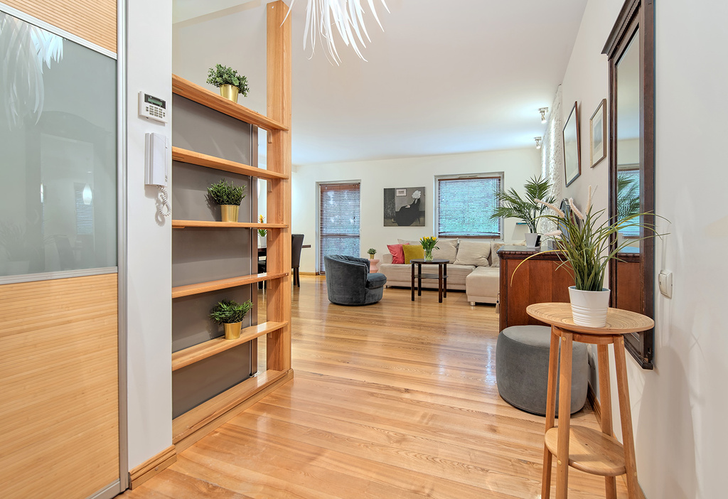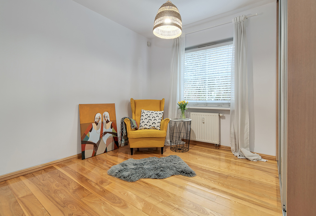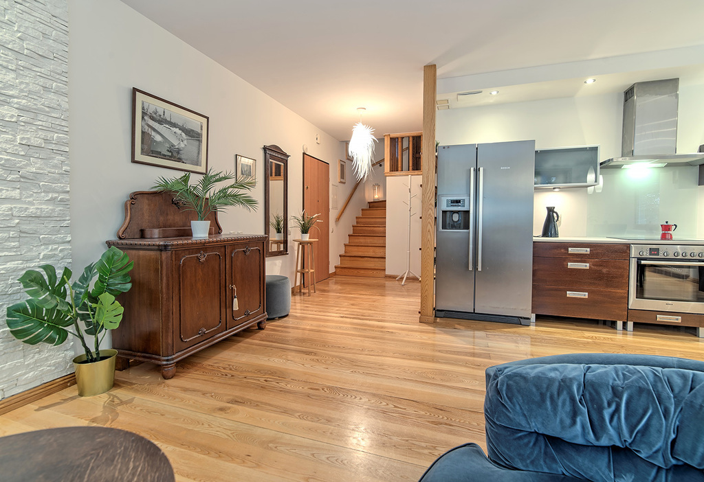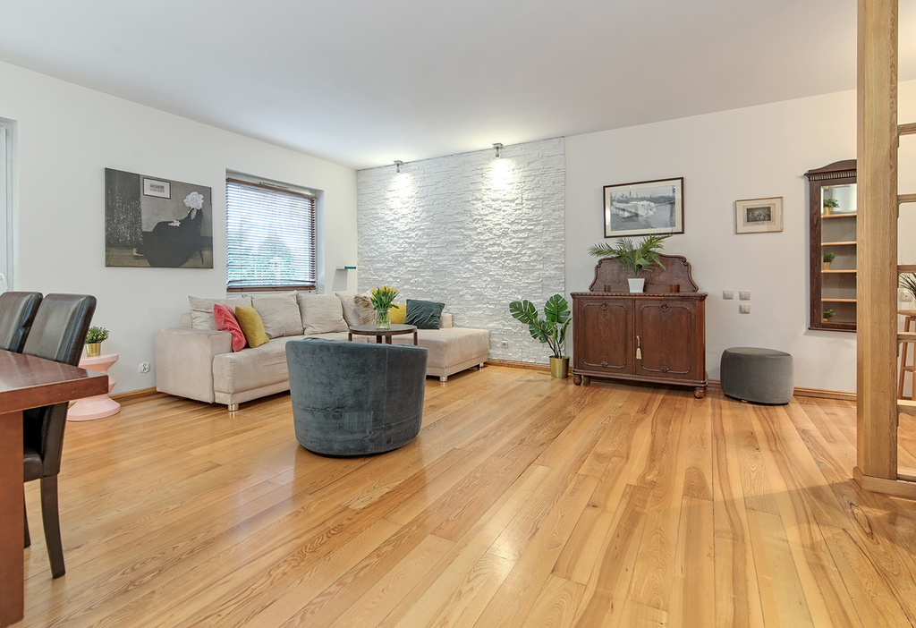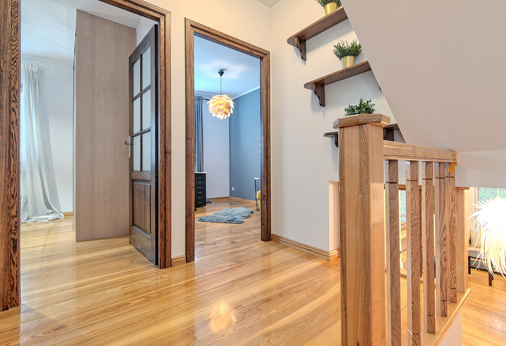 Przedmiotowy lokal został wykończony w podwyższonym standardzie, przy użyciu naturalnych i wysokiej jakości materiałów. Stolarka wewnętrzna w mieszkaniu, tj.: podłogi (z wyłączeniem łazienki), listwy przypodłogowe, drzwi (do łazienki i dwóch sypialni), schody oraz regał zostały wykonane z z litego drewna jesionowego.