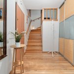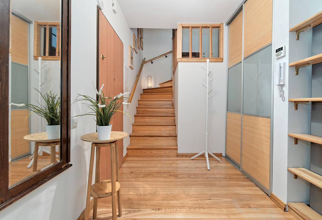 W przedpokoju dolnym znajduje się szafa wnękowa z drzwiami przesuwnymi.