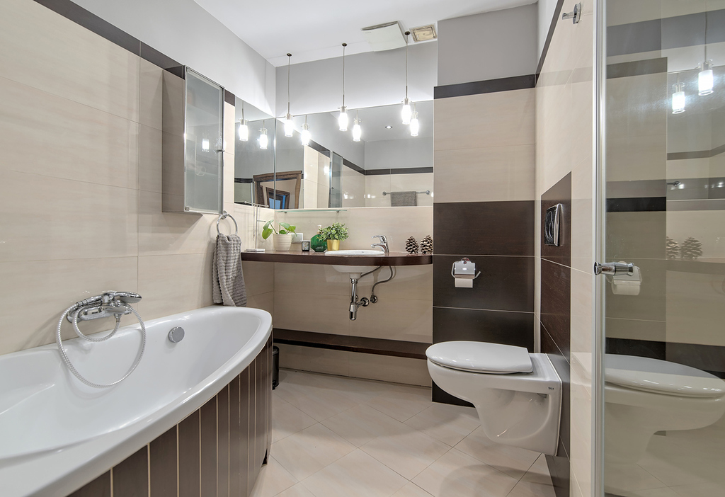 Łazienka wyposażona w duży prysznic typu walk in oraz narożną wannę.