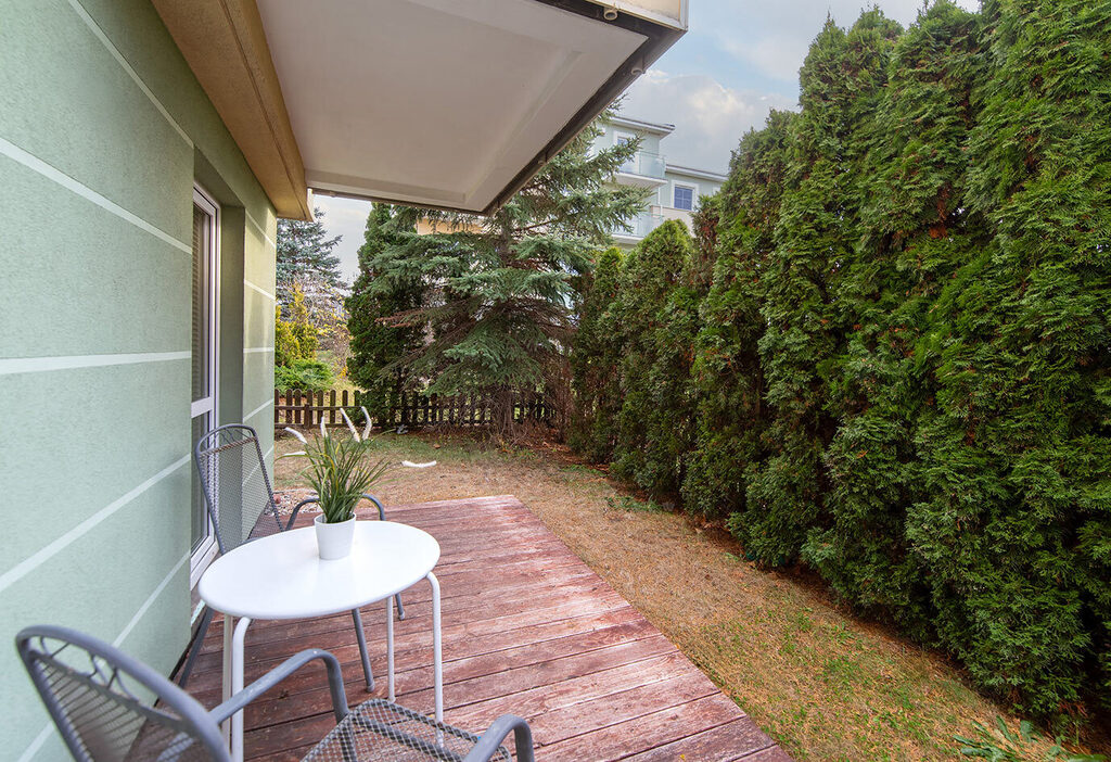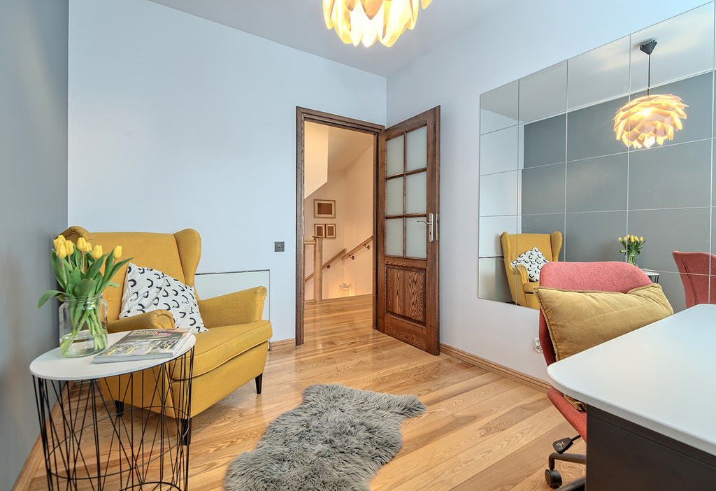 Na pierwszym poziomie mieszkania znajduje się część dzienna, na którą składają się: salon wraz z aneksem kuchennym, mały przedpokój oraz schody prowadzące na poziom drugi- części sypialnej. W salonie, od strony południowej znajduje się bezpośrednie wyjście do ogrodu. Wysokie, gęsto obsadzone wokół ogrodu tuje i świerki zapewniają poczucie prywatności.