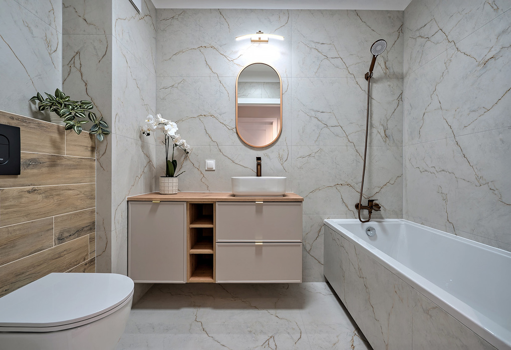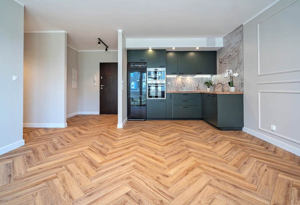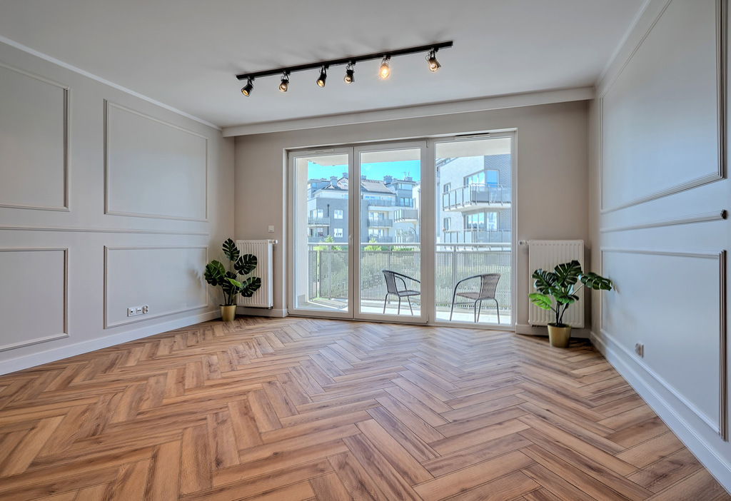 - salonu z aneksem kuchennym (21,4 m2) z wyjściem na przestronny balkon (5,92 m2)