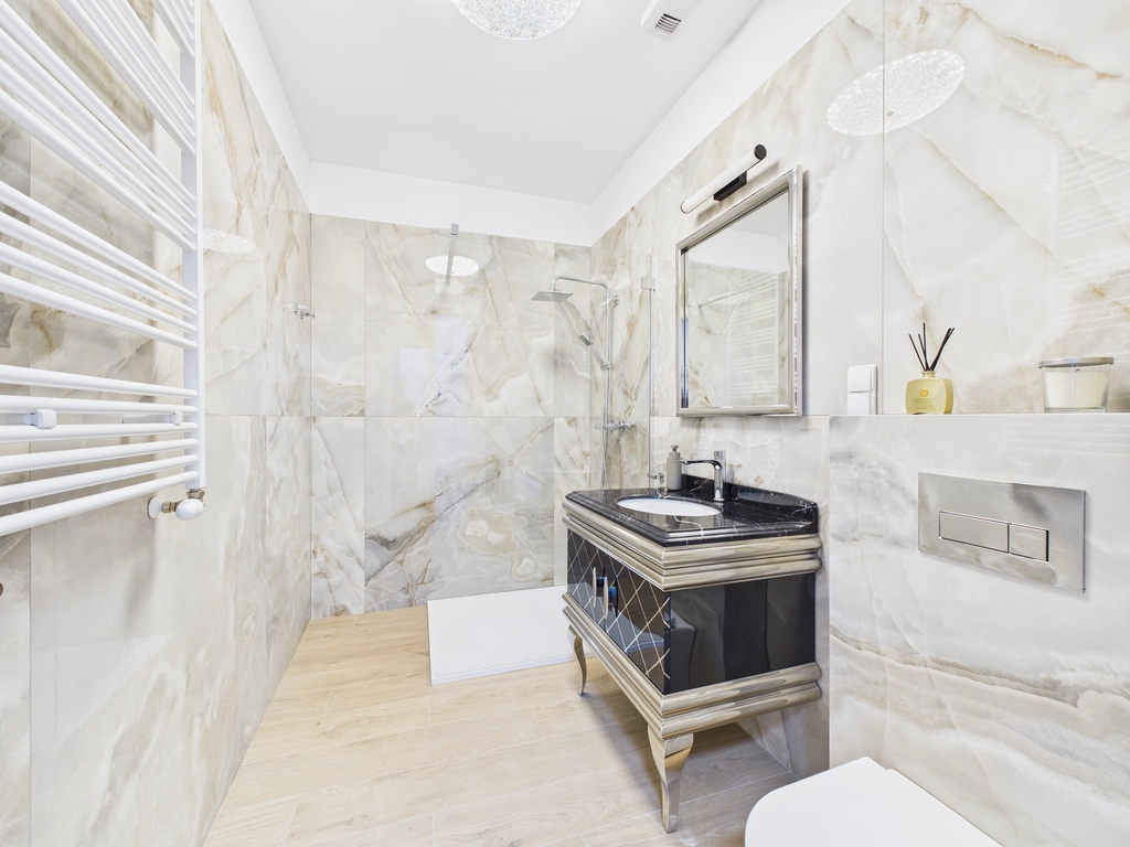 - Łazienka: hiszpańskie płytki MAINZU, kabina Radaway