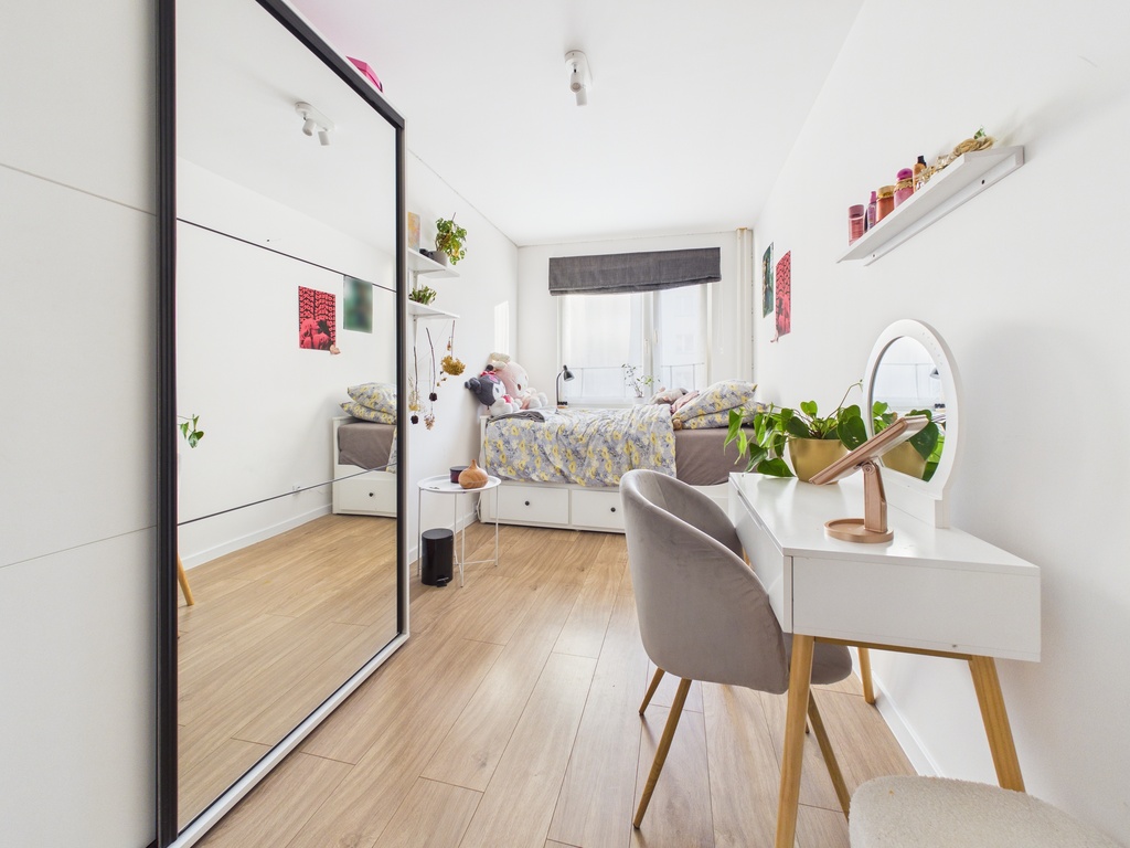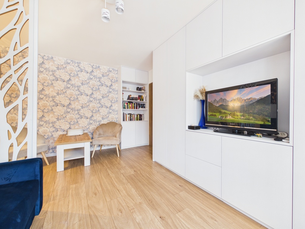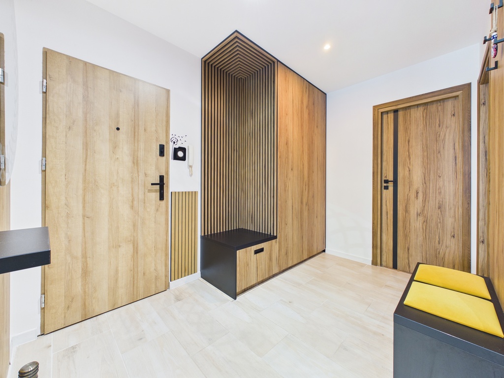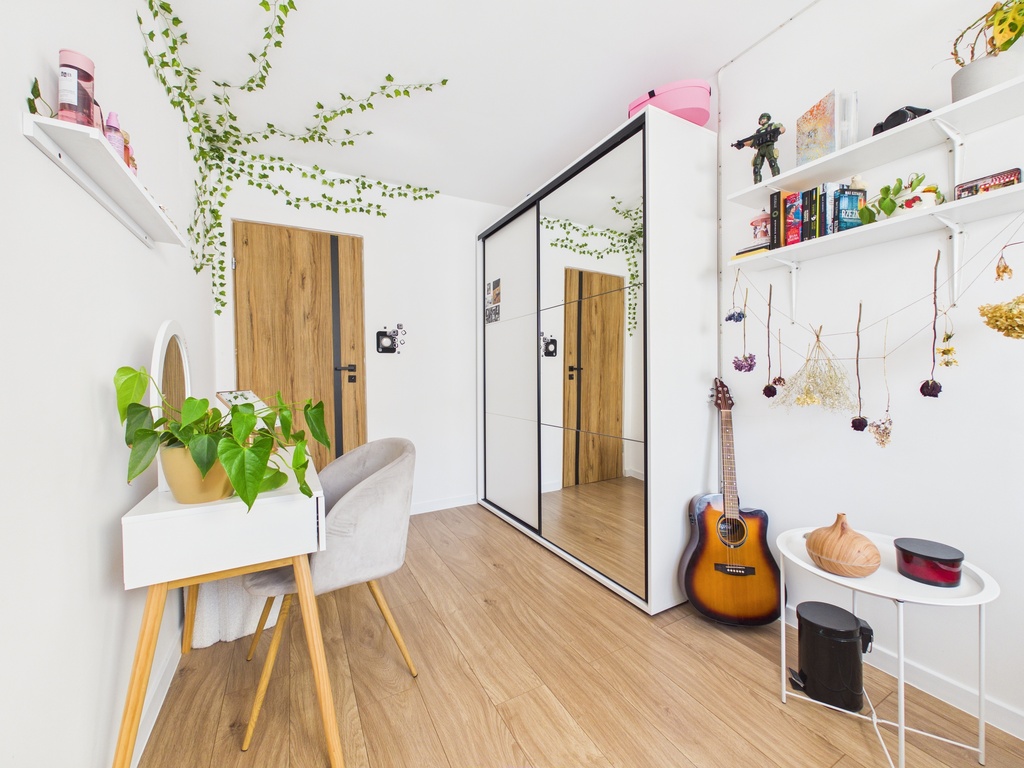W każdym pomieszczeniu zamontowane zostały pojemne szafy w zabudowie, które ułatwiają przechowywanie.