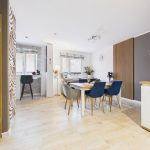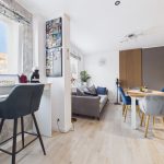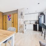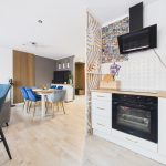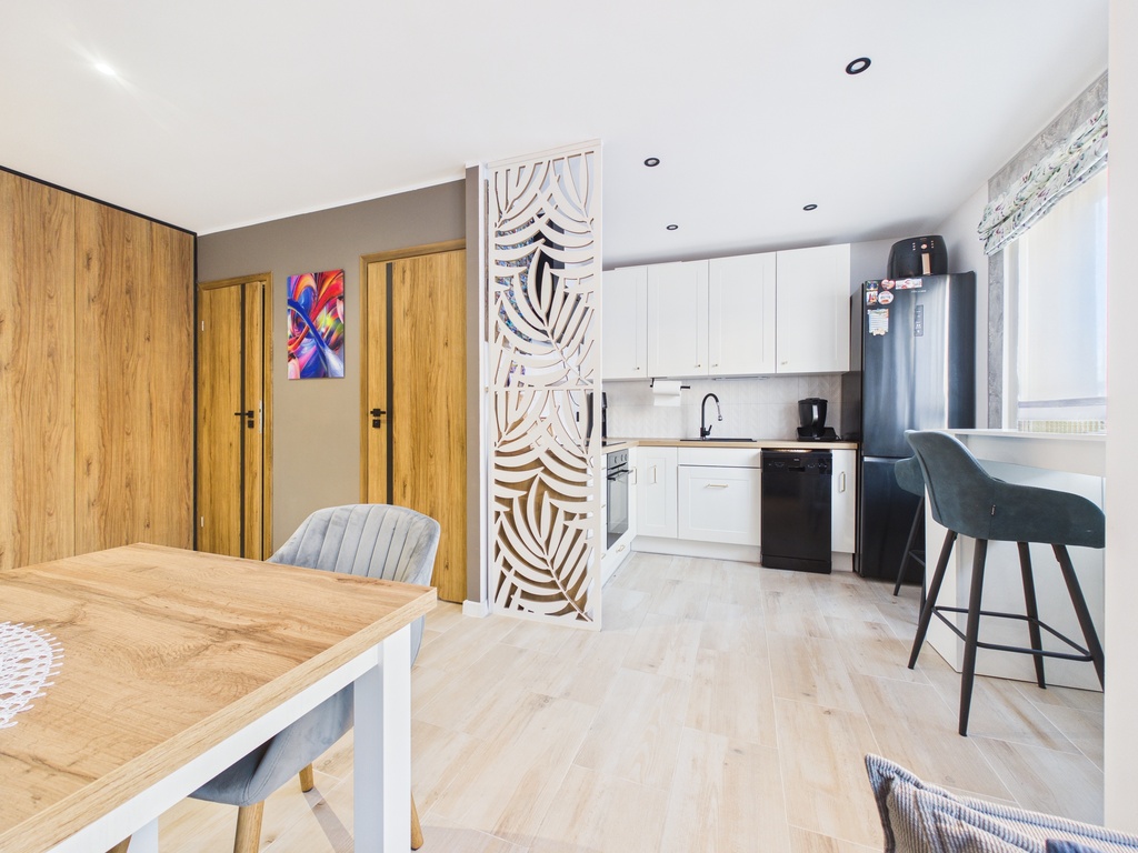 Kuchnia, pokój oraz przedpokój, po wyburzeniu ścianek, stanowią jedną otwartą przestrzeń.