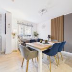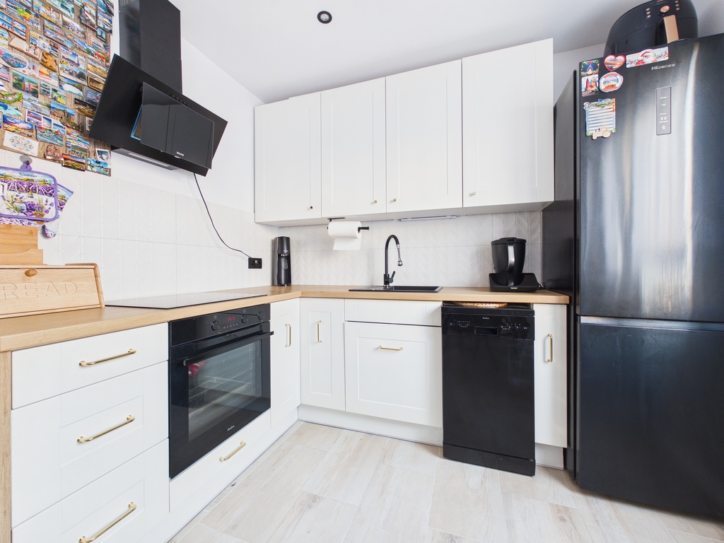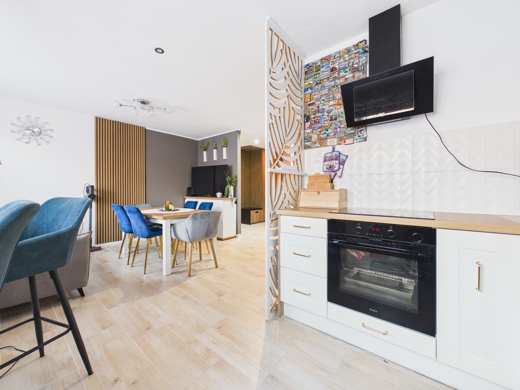 W kuchni znajdują się meble w zabudowie, piekarnik, płyta indukcyjna, zmywarka oraz lodówka. Zrezygnowano z instalacji gazowej w nieruchomości.