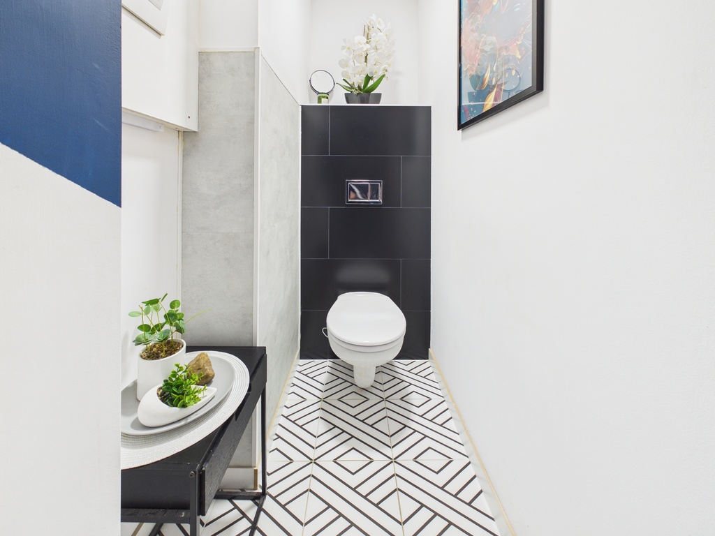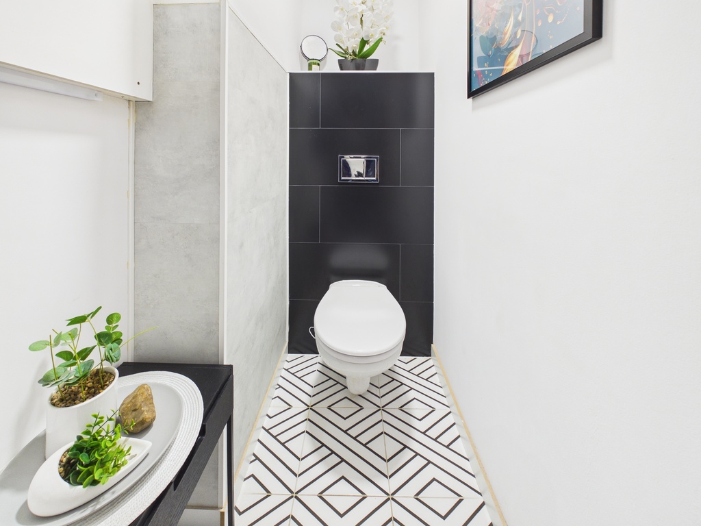 W łazience i osobnej toalecie położono nowoczesną glazurę.