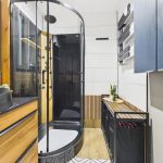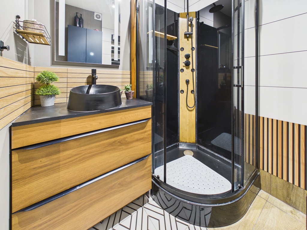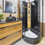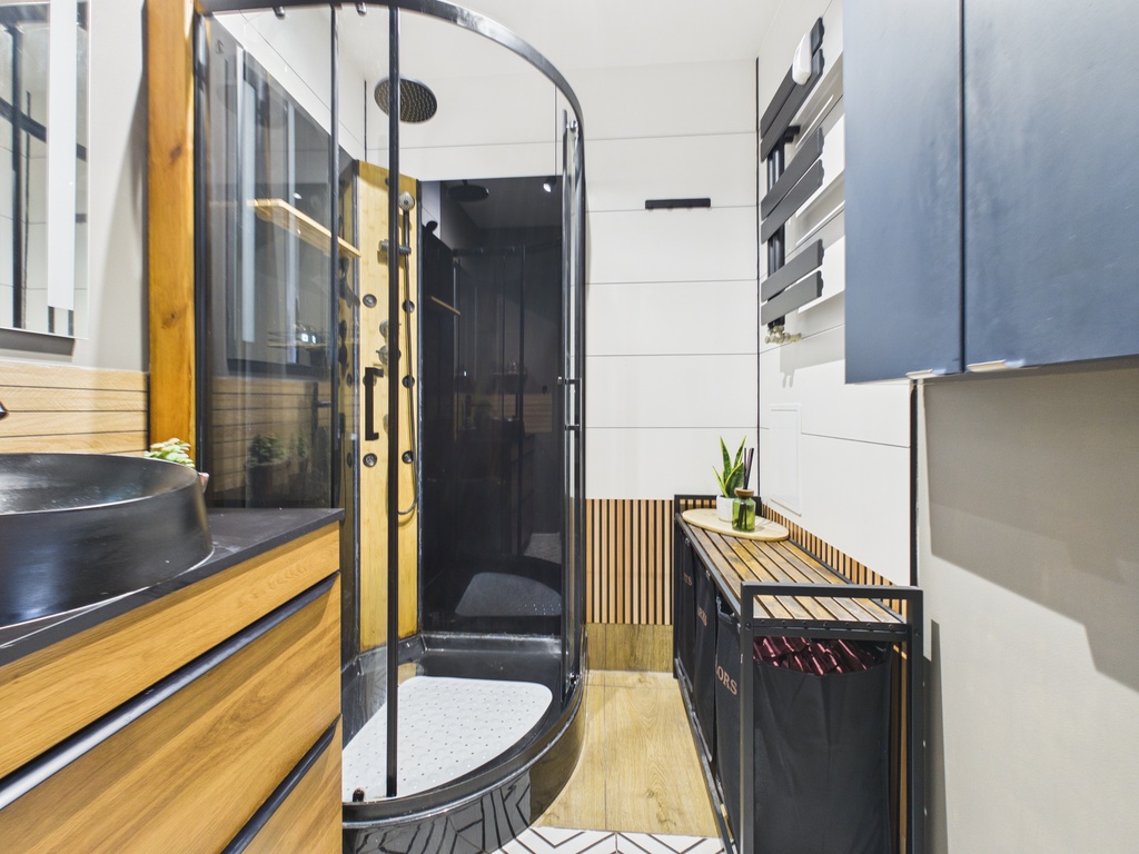 Łazienka wyposażona jest w kabinę prysznicową, umywalkę i pralkę.