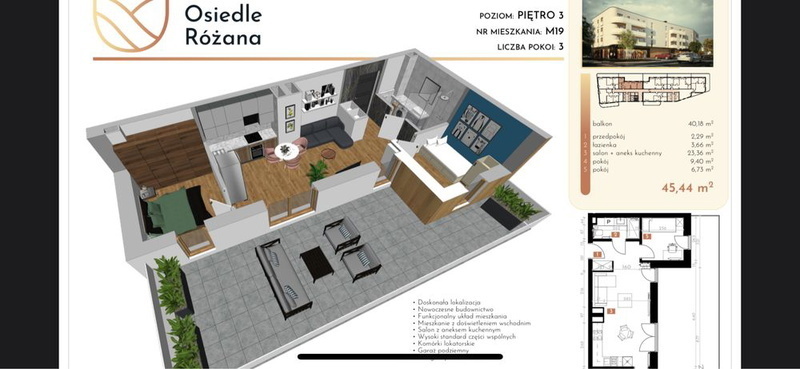 Mieszkanie o powierzchni 45,44m2, składa się z: - Salonu z aneksem kuchennym