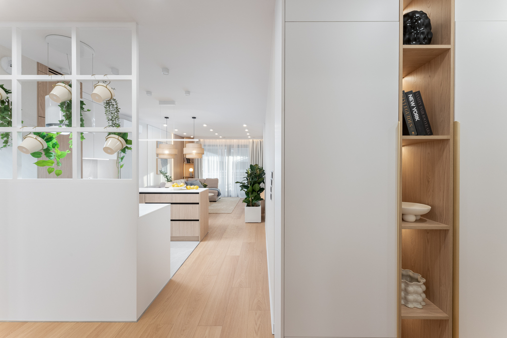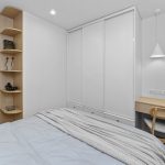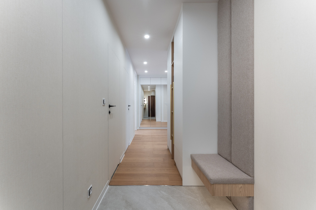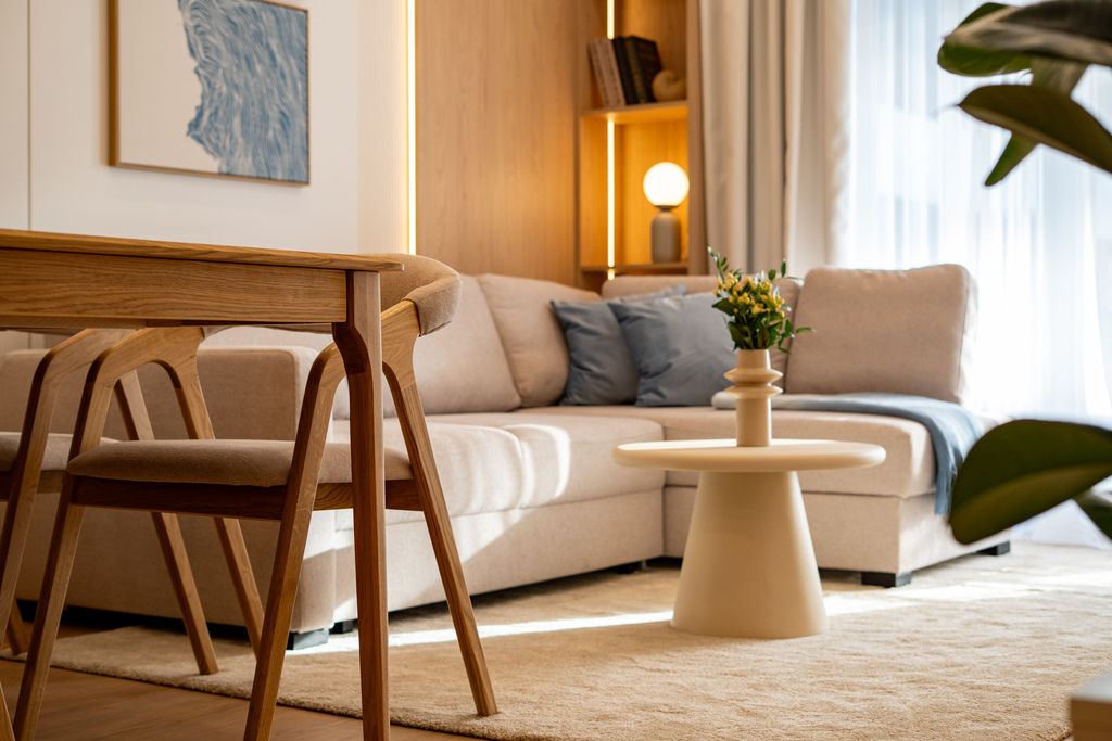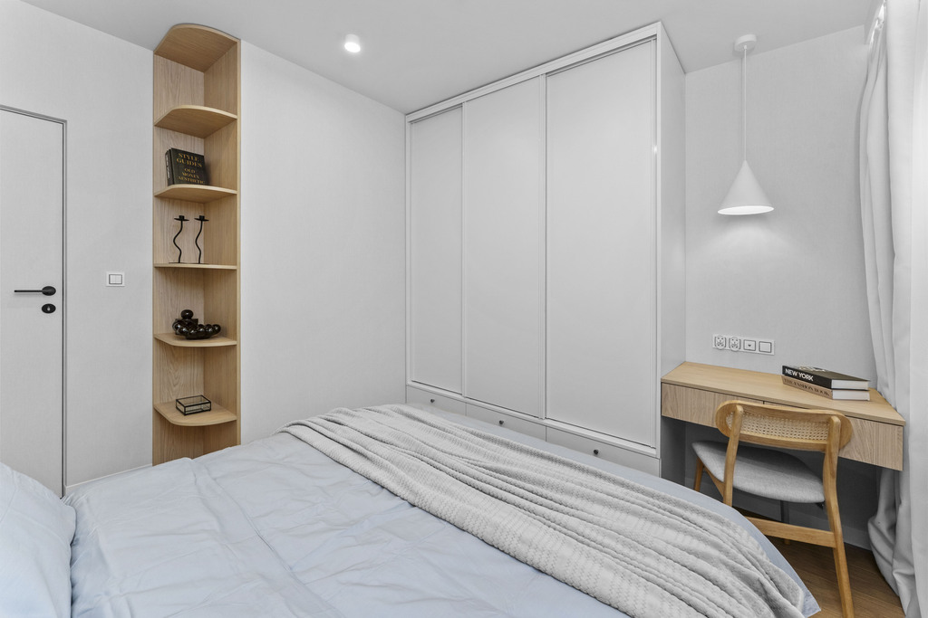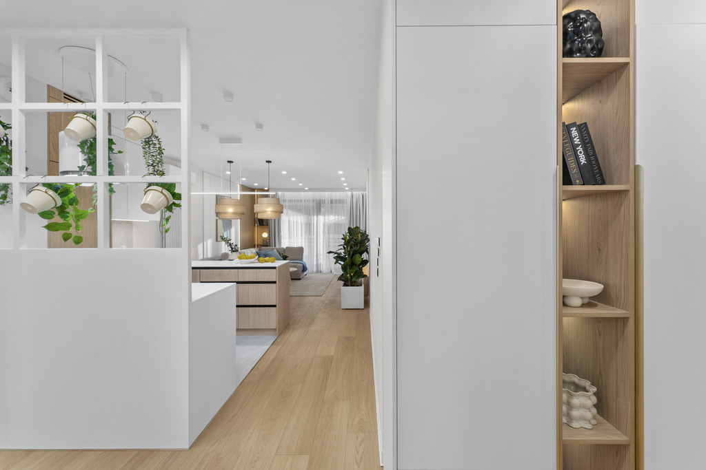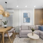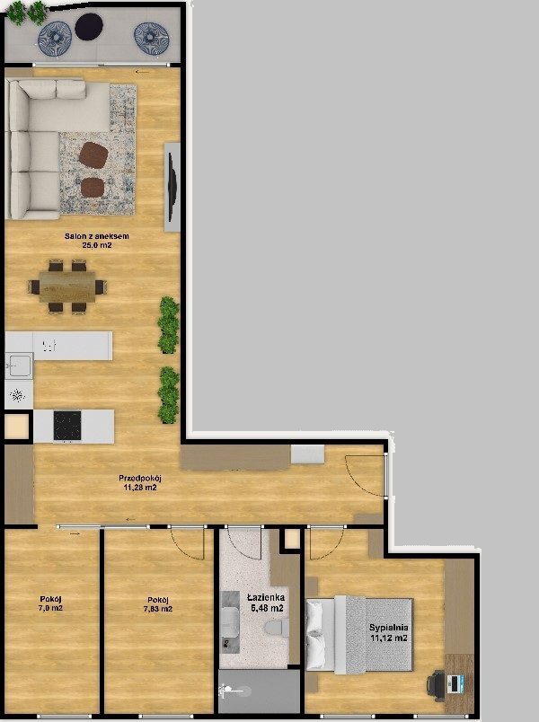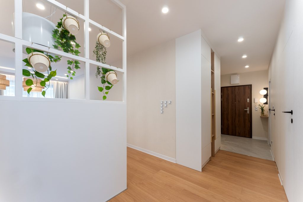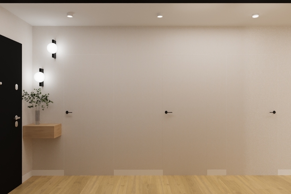 W salonie zaplanowano kanapę narożną, stół z krzesłami, regał i szafkę RTV. W łazience znajdzie się prysznic typu walk-in, szafka umywalkowa, pralko-suszarka oraz zabudowa meblowa. W sypialni głównej – łóżko 180 cm, szafy na wymiar i biurko. Dwie pozostałe sypialnie pozostaną do indywidualnej aranżacji. W przedpokoju – pojemne szafy i tapicerowane siedzisko. W mieszkaniu zostanie zainstalowana klimatyzacja.