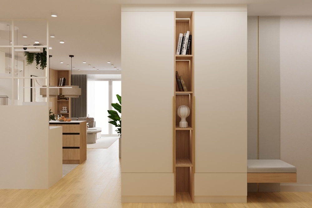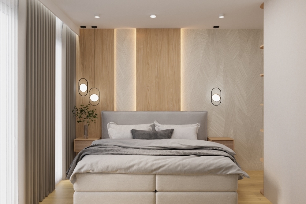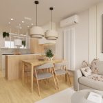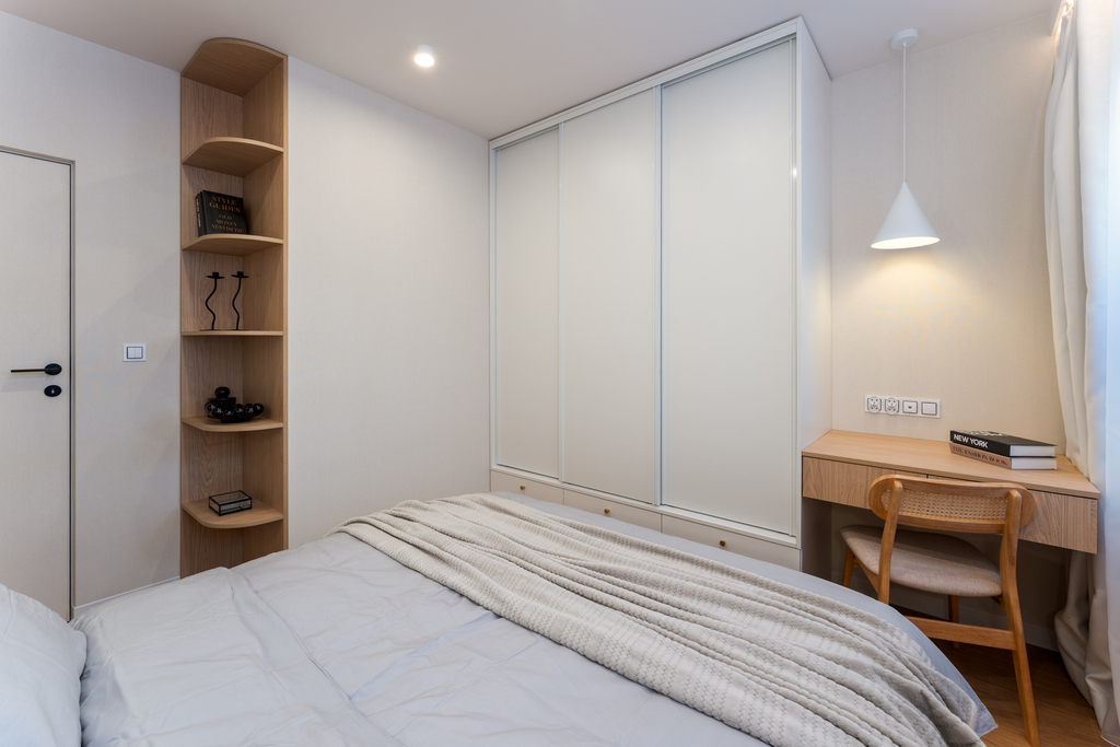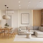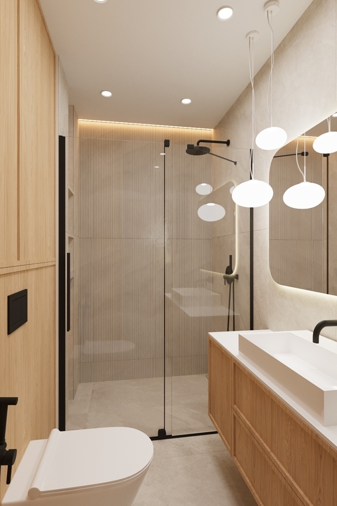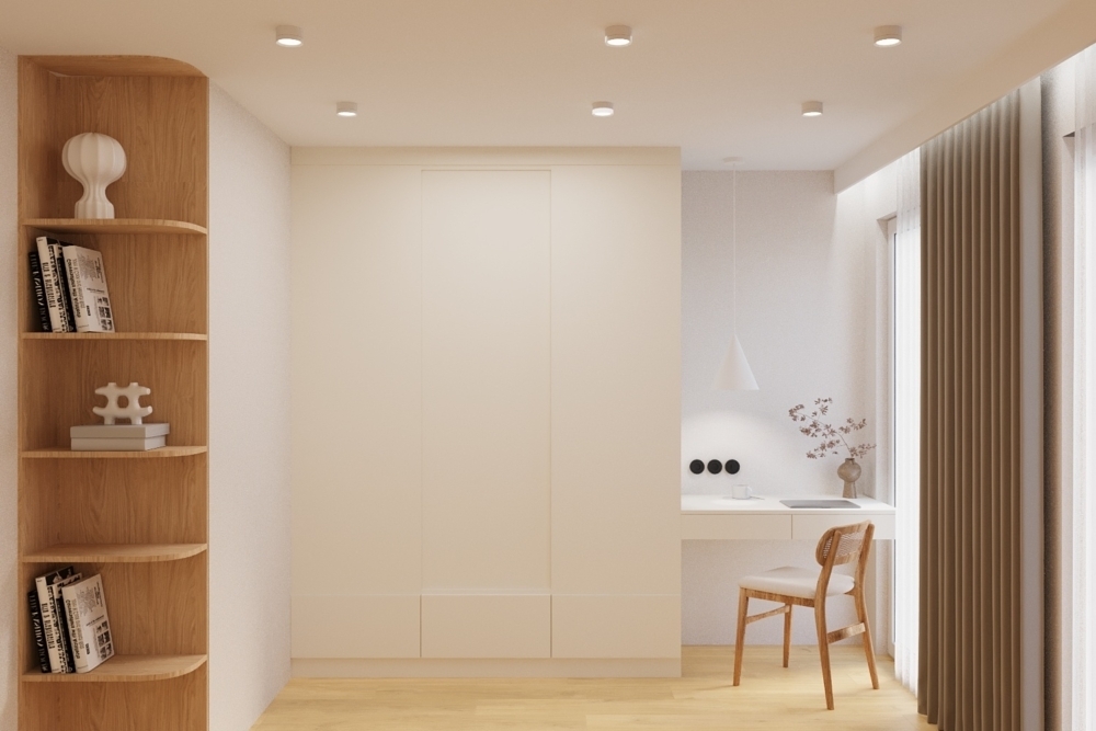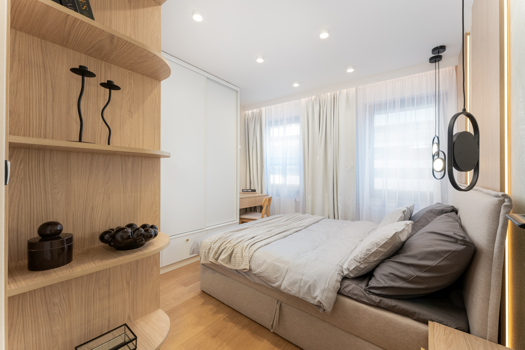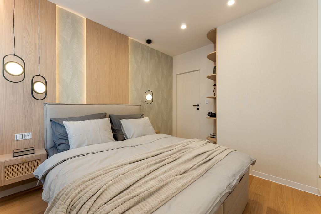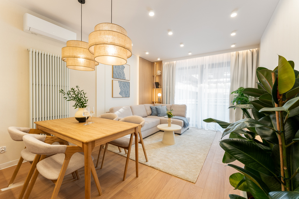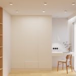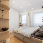 W salonie zaplanowano kanapę narożną, stół z krzesłami, regał i szafkę RTV. W łazience znajdzie się prysznic typu walk-in, szafka umywalkowa, pralko-suszarka oraz zabudowa meblowa. W sypialni głównej – łóżko 180 cm, szafy na wymiar i biurko. Dwie pozostałe sypialnie pozostaną do indywidualnej aranżacji. W przedpokoju – pojemne szafy i tapicerowane siedzisko. W mieszkaniu zostanie zainstalowana klimatyzacja.