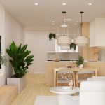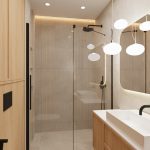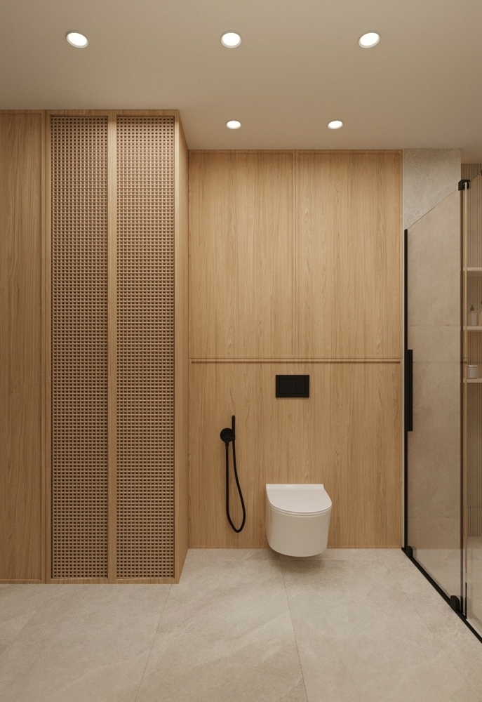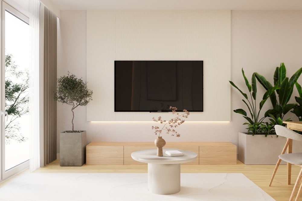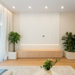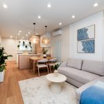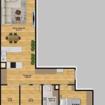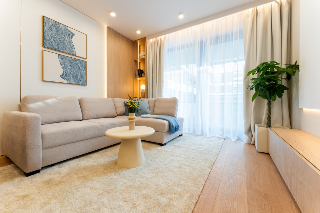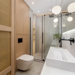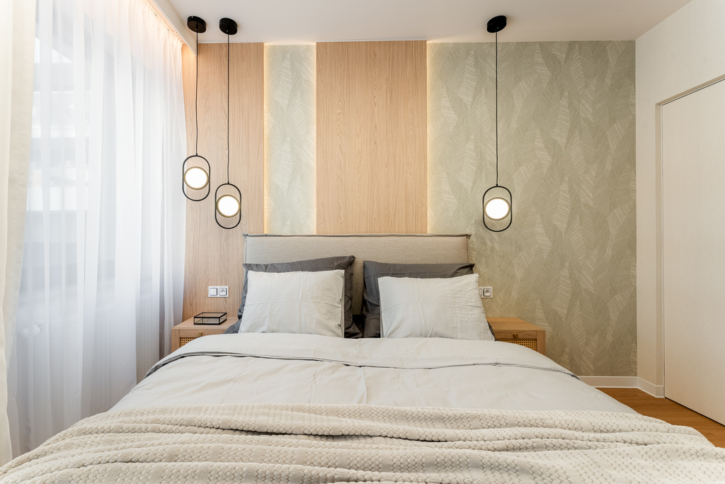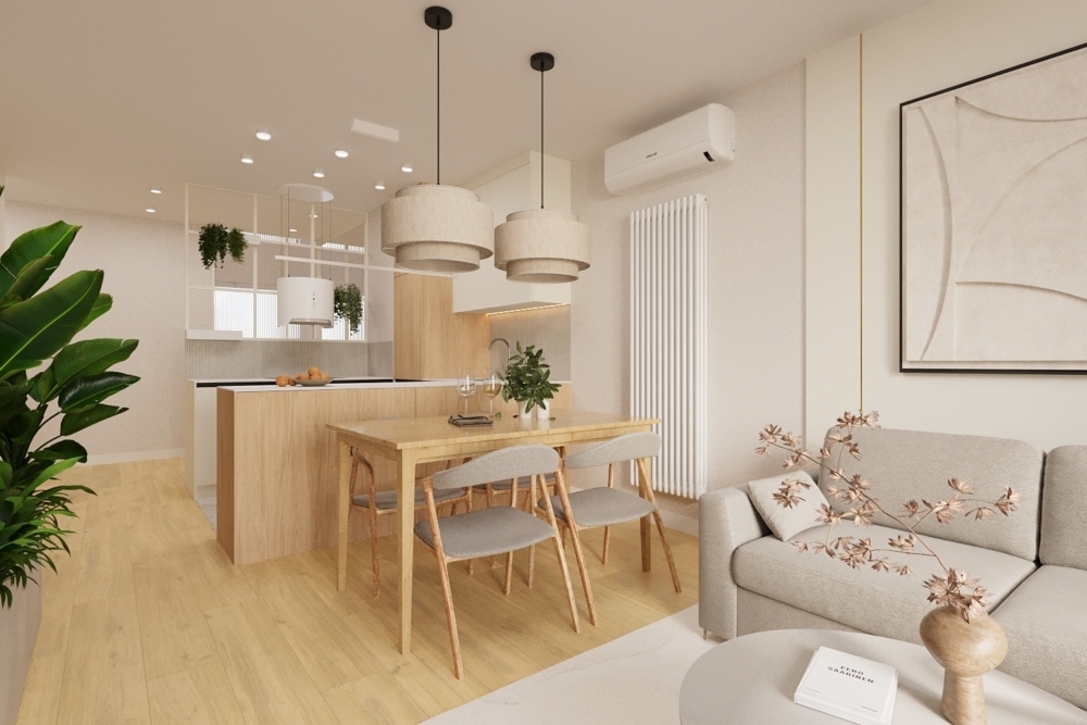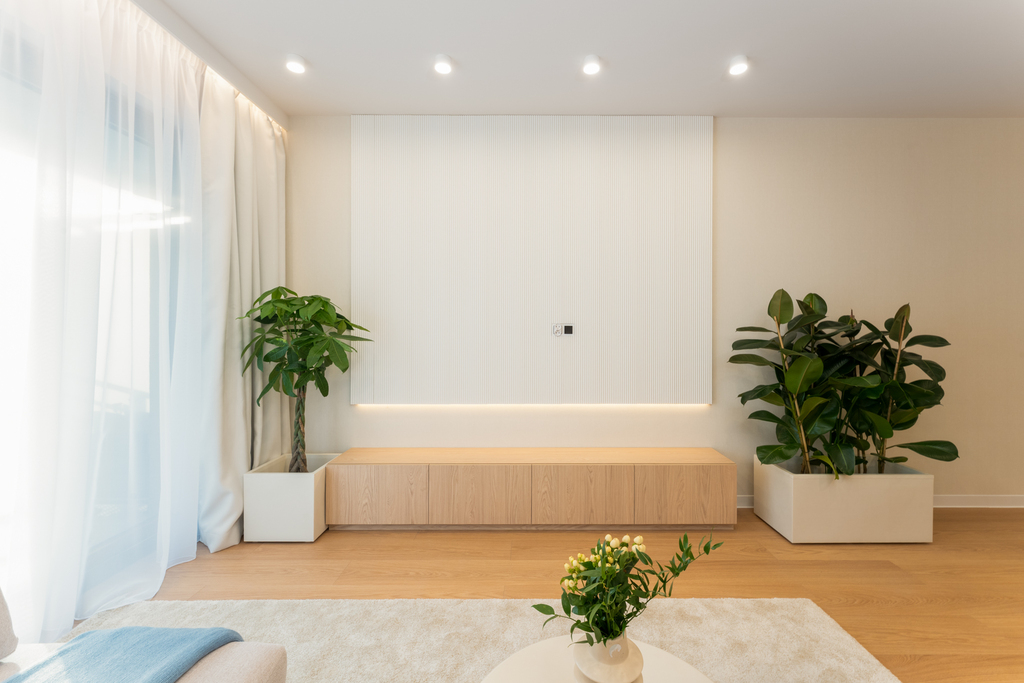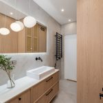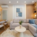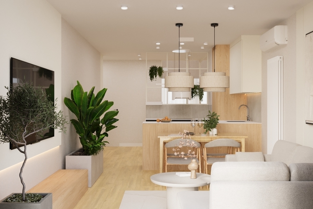 W salonie zaplanowano kanapę narożną, stół z krzesłami, regał i szafkę RTV. W łazience znajdzie się prysznic typu walk-in, szafka umywalkowa, pralko-suszarka oraz zabudowa meblowa. W sypialni głównej – łóżko 180 cm, szafy na wymiar i biurko. Dwie pozostałe sypialnie pozostaną do indywidualnej aranżacji. W przedpokoju – pojemne szafy i tapicerowane siedzisko. W mieszkaniu zostanie zainstalowana klimatyzacja.
