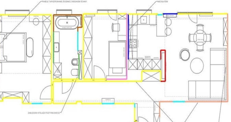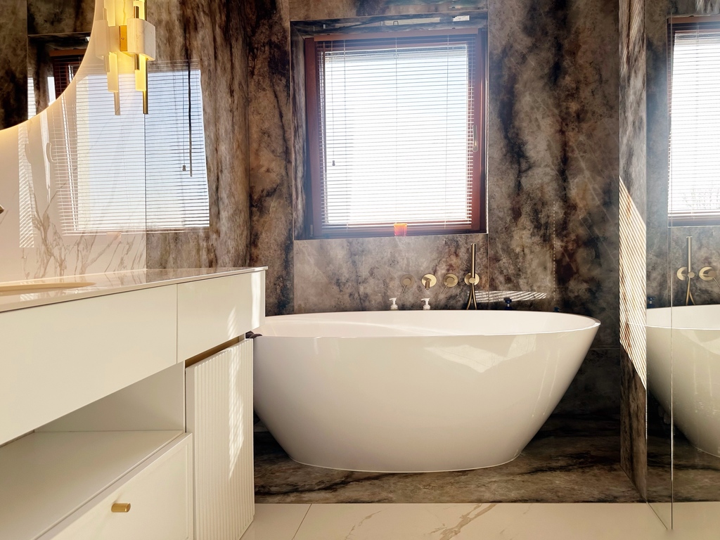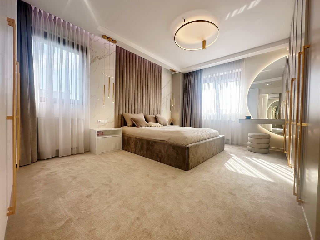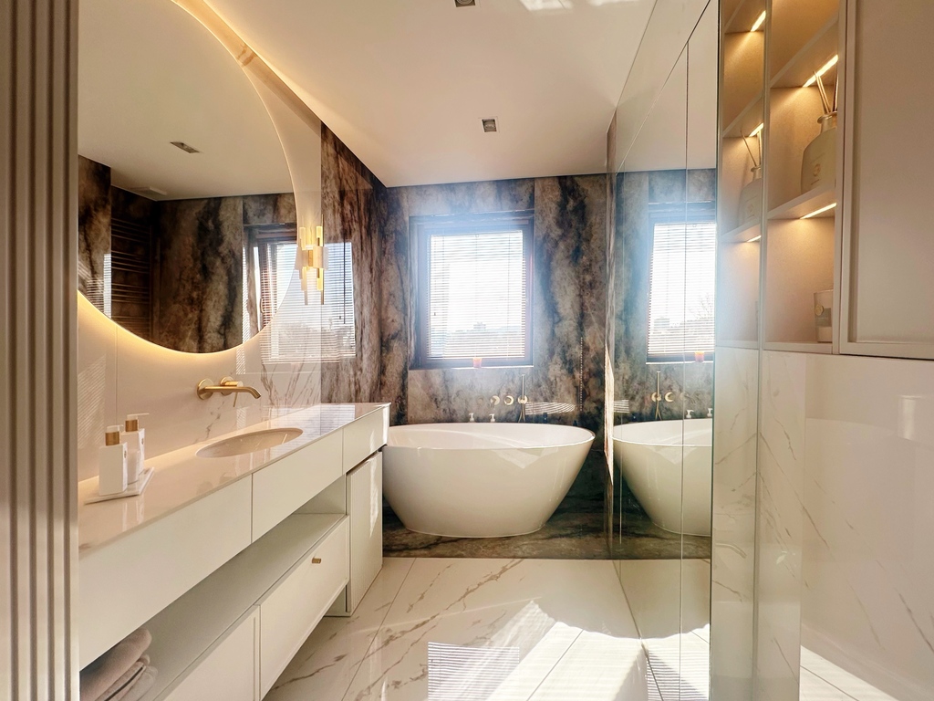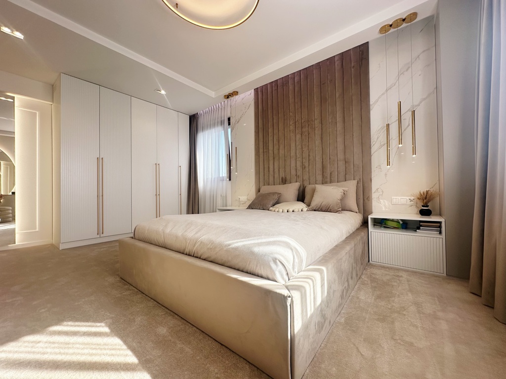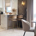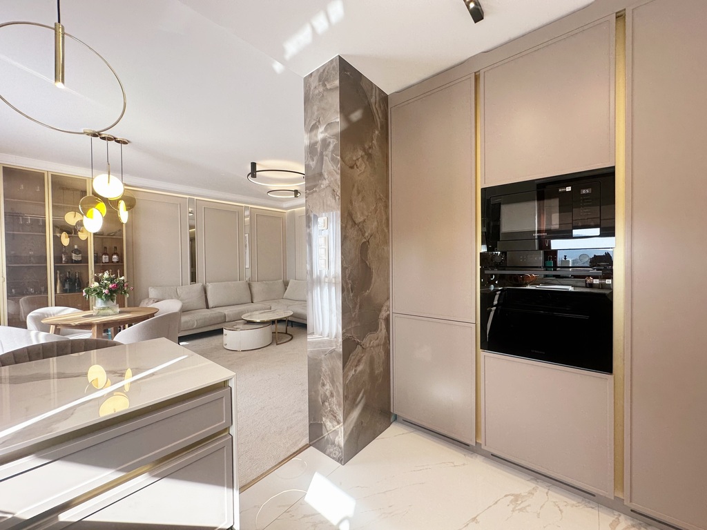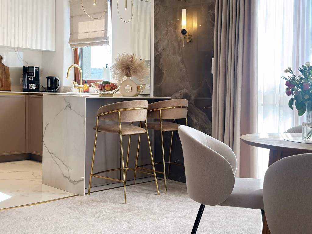 Apartament został wykończony w bardzo wysokim standardzie, materiałami najwyższej klasy. Przestrzeń została zaprojektowana praktycznie a zarazem w bardzo designerskim stylu z nutą luksusu. Znajdziemy tutaj spiek, wielkoformatowe płytki, wysokiej jakości wykładzinę, zabudowę stolarską, kominek bio. Na całej powierzchni mieszkania znajduje się ogrzewanie podłogowe.