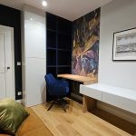 Mieszkanie składa się z salonu z aneksem kuchennym, sypialni, gabinetu, łazienki, garderoby oraz przedpokoju.