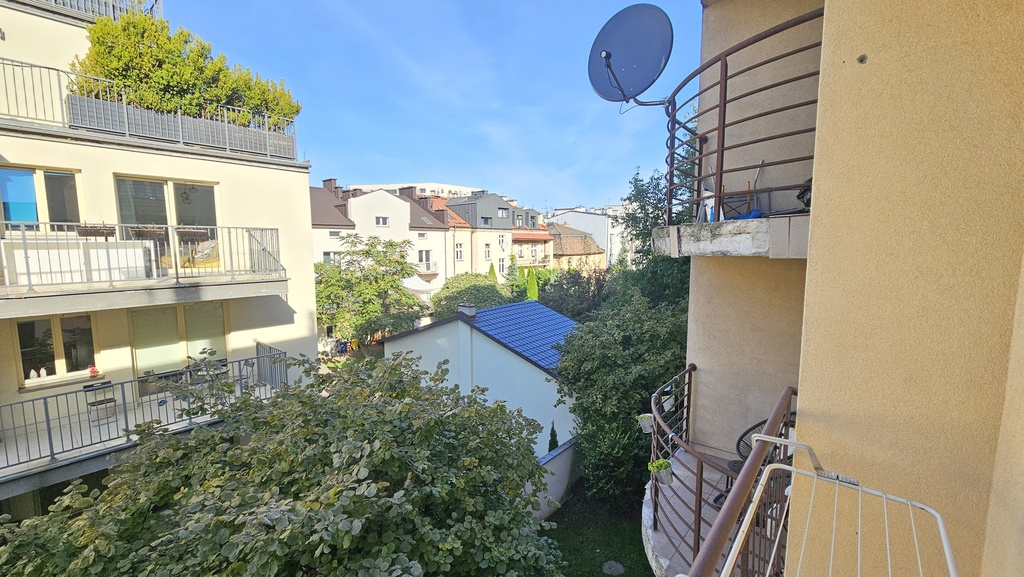 Mieszkanie znajduje się bardzo blisko ścisłego centrum Krakowa. Nieopodal znajdują się przystanki autobusowe oraz tramwajowe a niewielka odległość do Rynku zachęca do spacerów po starówce. Miejsca postojowe usytuowane są wzdłuż ulicy i są ogólnodostępne. Okolica jest cicha i spokojna.