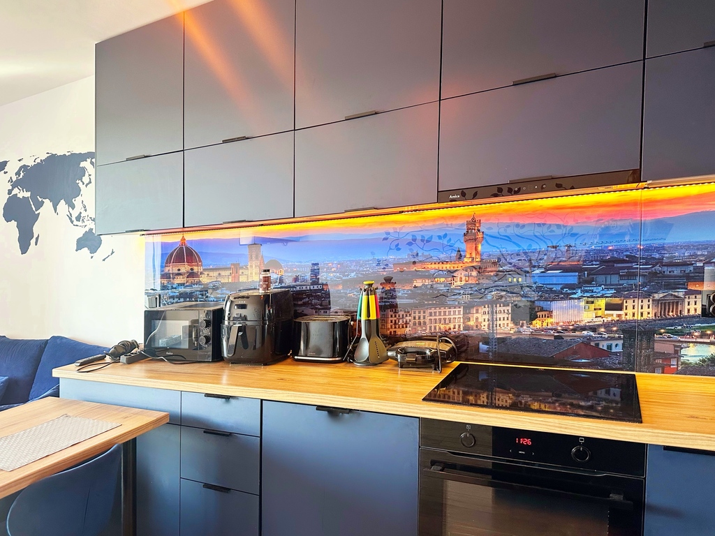 W salonie znajdziemy bio kominek, dekoracyjne grzejniki, meble na wymiar, w kuchni blaty oraz zabudowa na zamówienie (materiały premium), sprzęty najwyższej jakości.