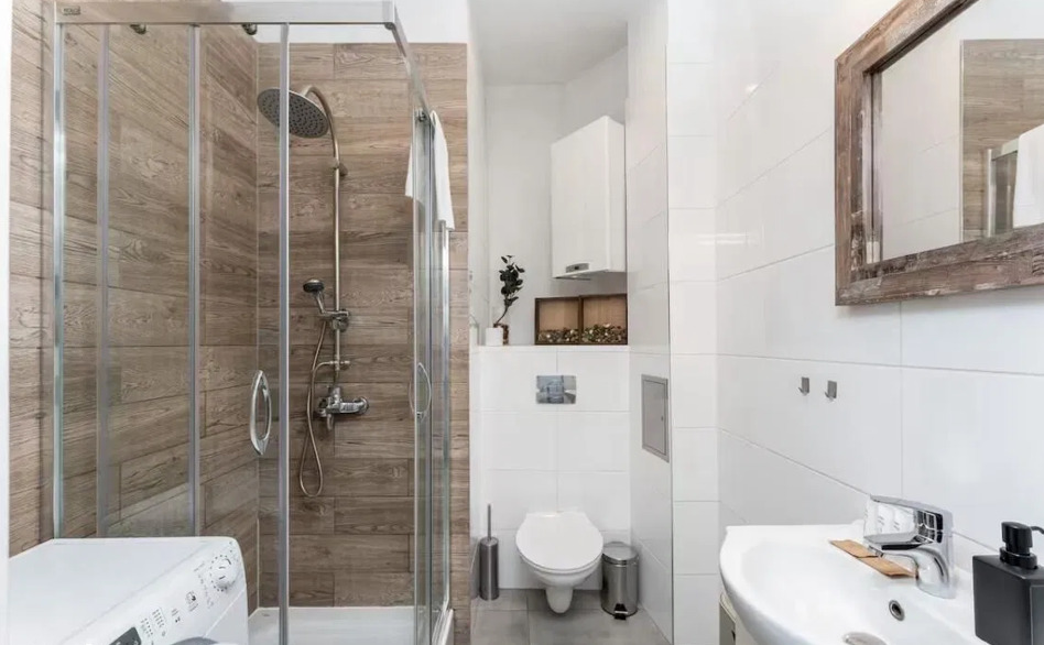 • Łazienka z prysznicem – wykończona w dobrym standardzie, z pralką
