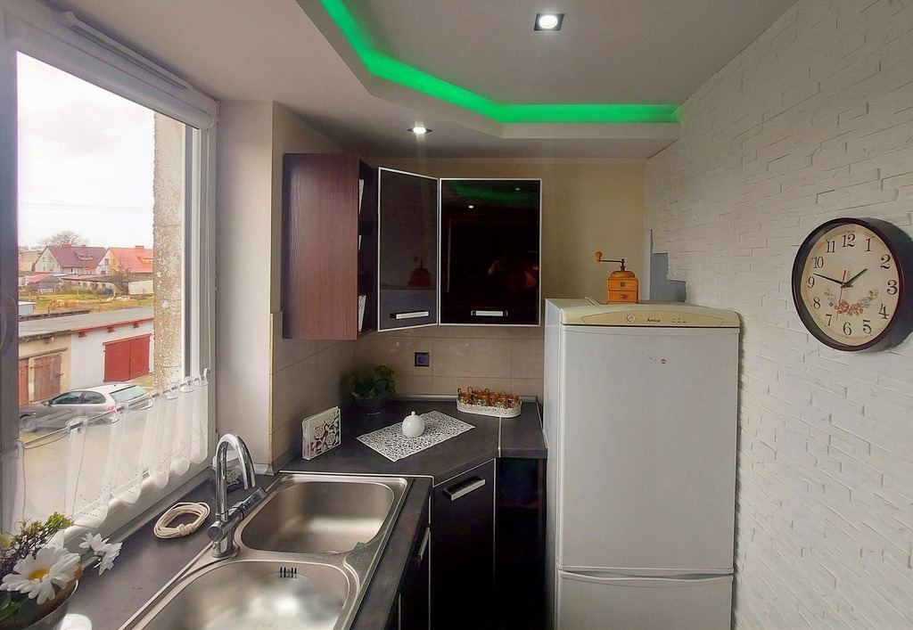 - oddzielna kuchnia z oknem i meblami w stałej zabudowie