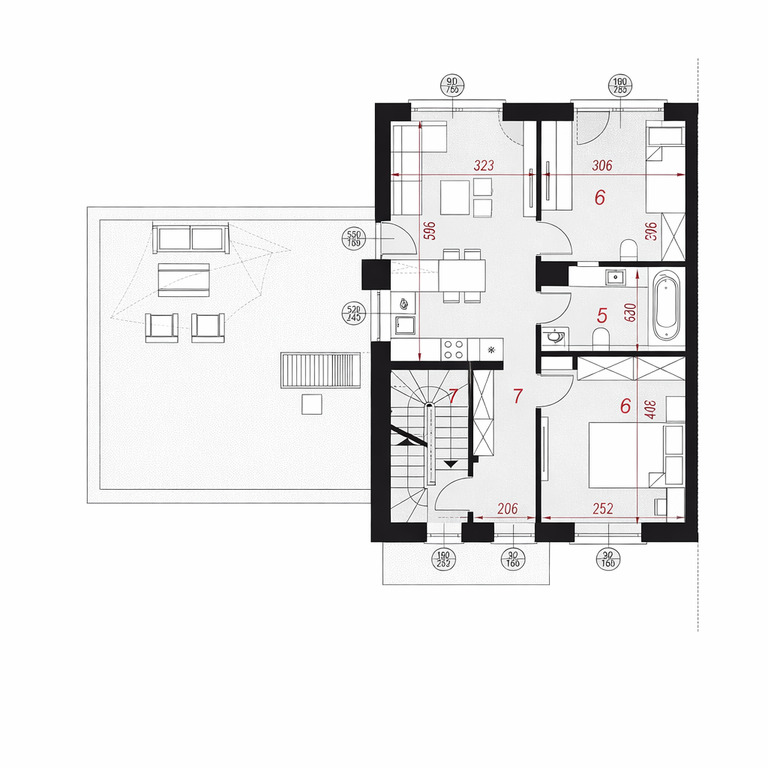- dwupoziomowy układ zapewniający komfort i wyraźny podział na strefę dzienną i prywatną