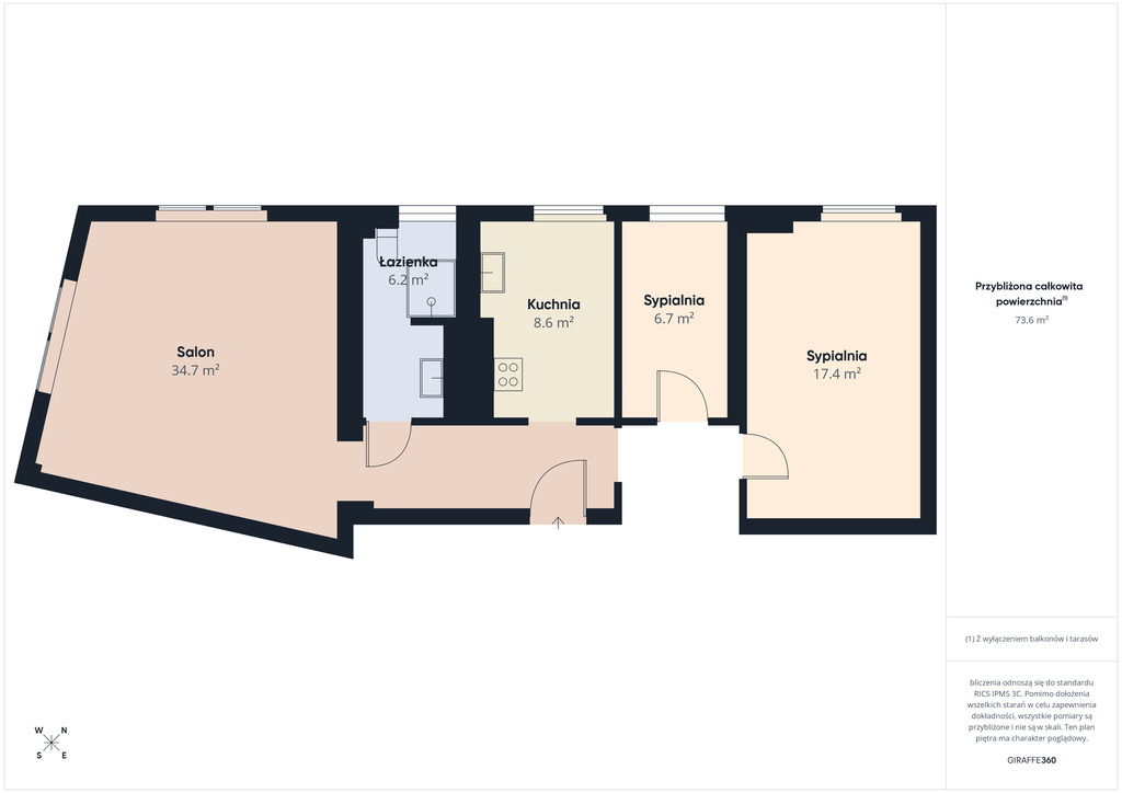 W skład mieszkania o powierzchni 74 m2 wchodzi: