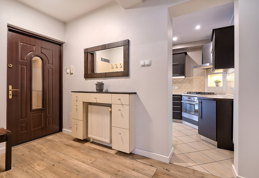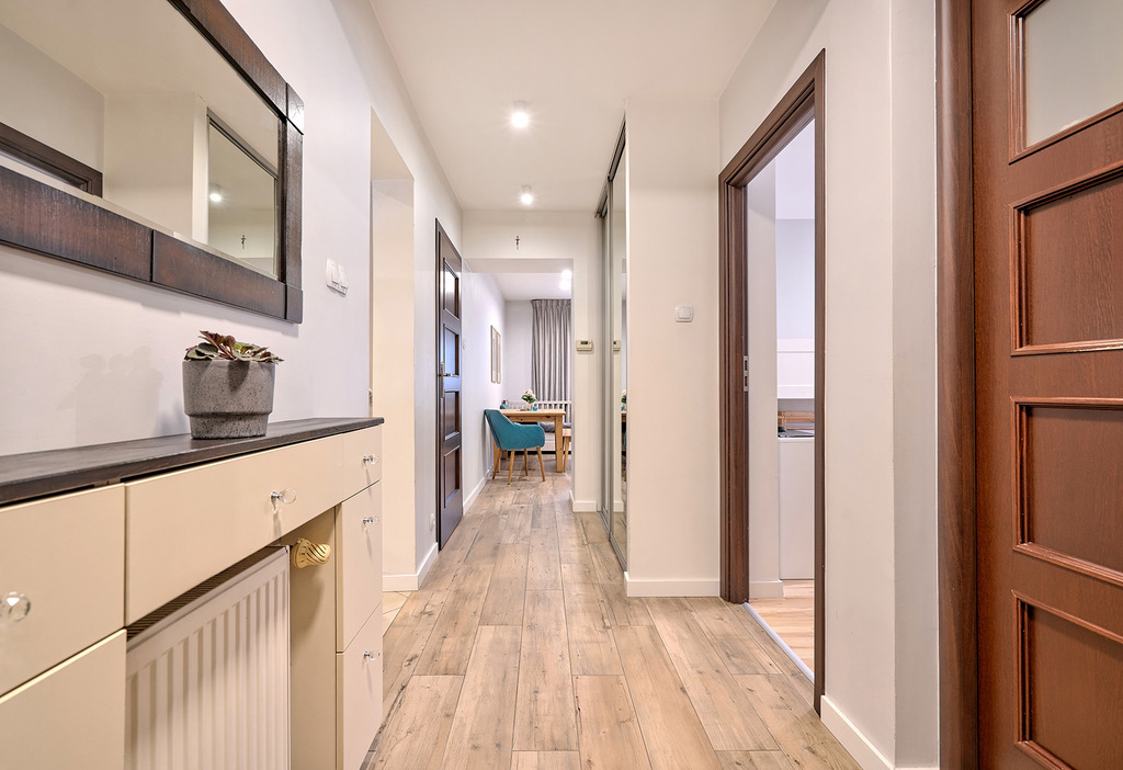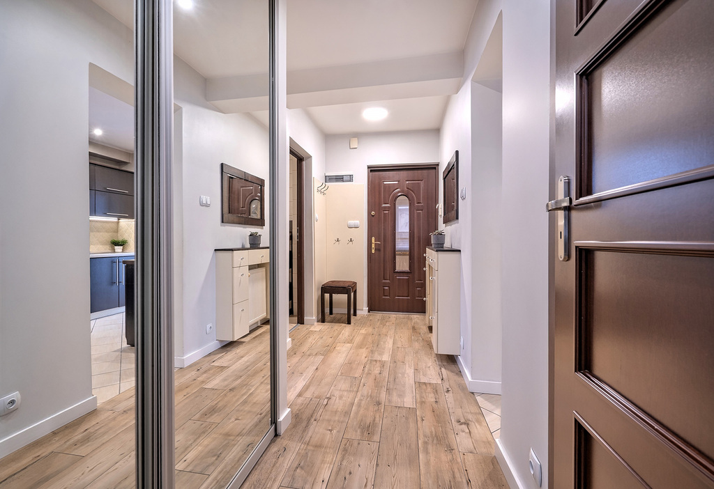 - Przedpokój 7,3m2 w którym znajduję się szafa w zabudowie