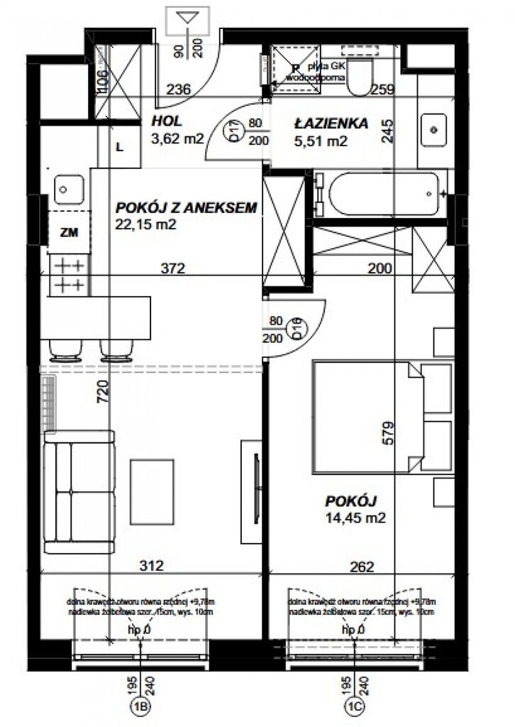 • Pokój dzienny z aneksem 22,14 m2