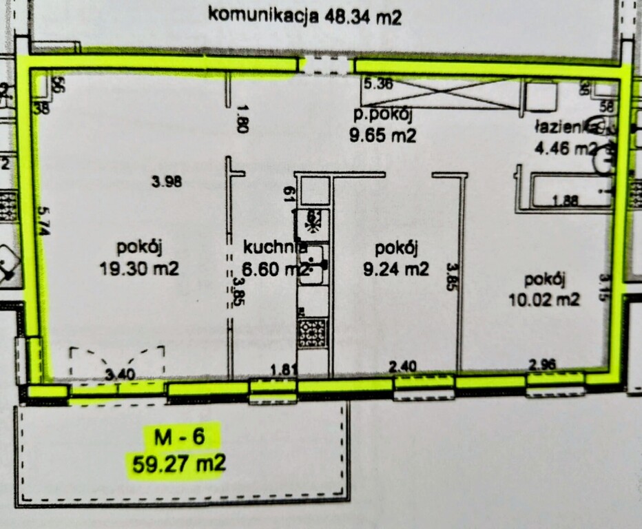 • salon z aneksem kuchennym – 19,30 m² + 6,60 m²