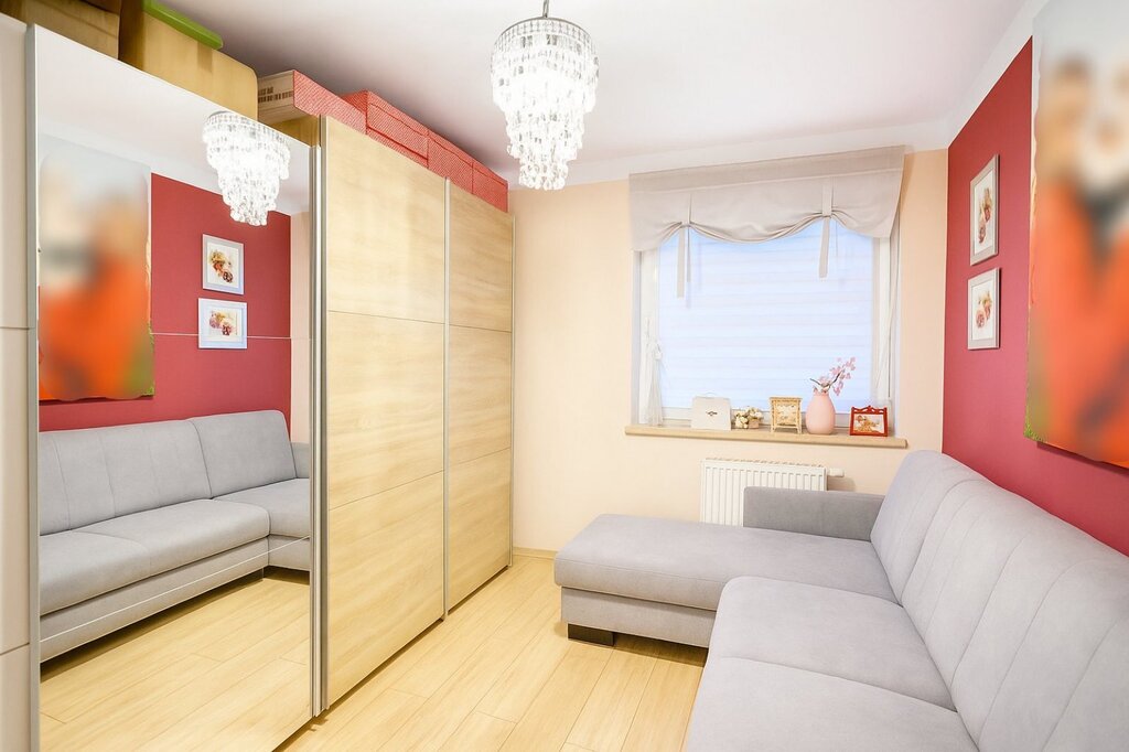 Nieruchomość wyróżnia się przemyślanym układem, dzięki któremu na małej powierzchni znajdziemy salon z aneksem i dwie ustawne sypialnie.