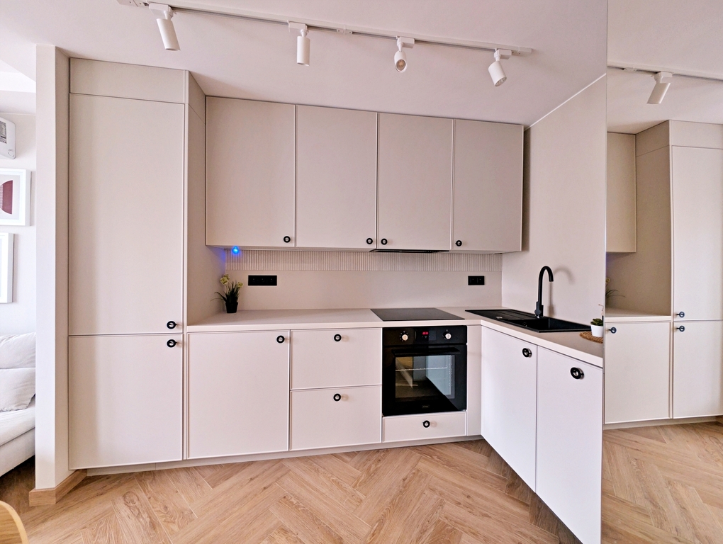 - meble kuchenne w zabudowie (w cenie mieszkania sprzęt AGD: piekarnik, płyta indukcyjna, zmywarka, okap, zlew, lodowka z zamrażarką)