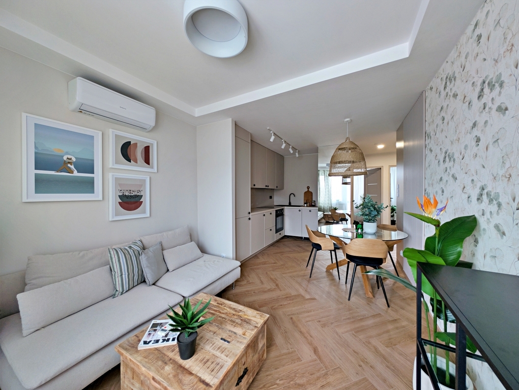 mieszkanie mierzy 42,99 m2 (w rzeczywistości po pomiarach 46 m2) powierzchni użytkowej i znajduje się na 3 piętrze niskiego bloku. Na powierzchnię składają się salon z aneksem, 2 pokoje, łazienka oraz przedpokój.