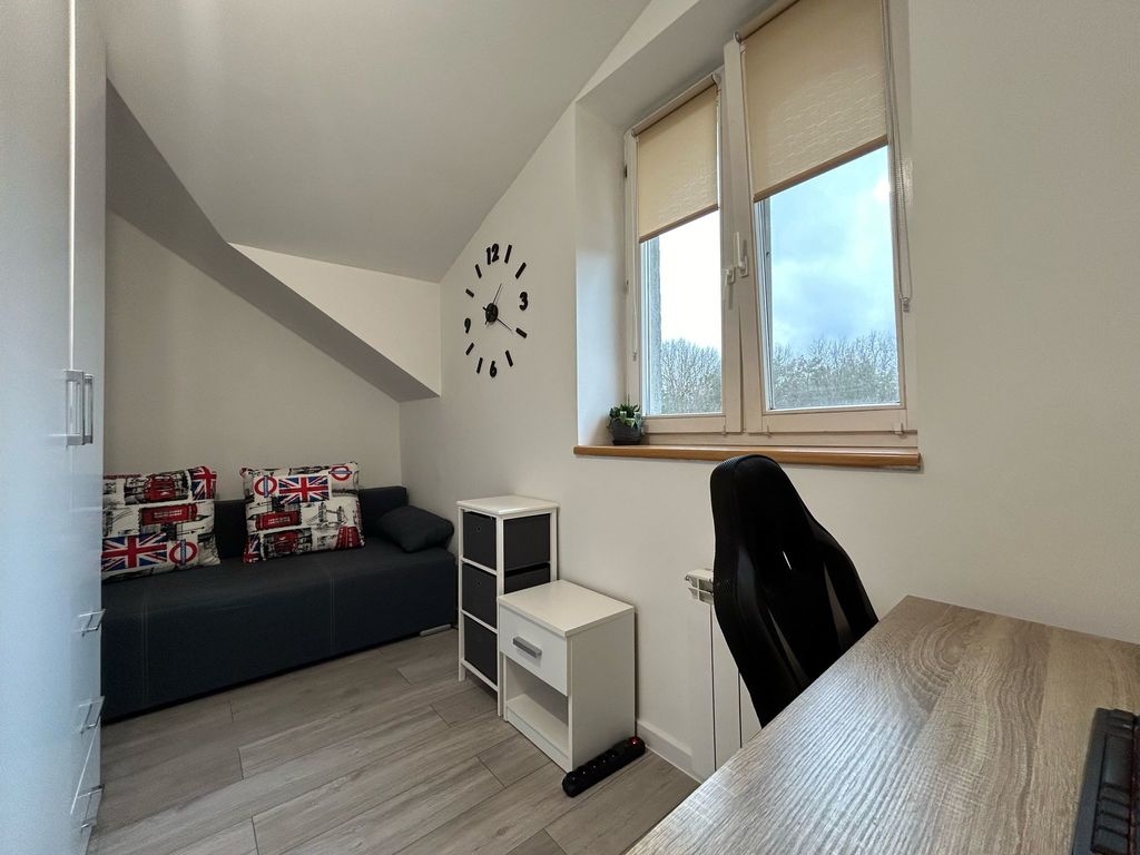 * Optymalne wykorzystanie przestrzeni skośnych ścian pozwoliło na stworzenie funkcjonalnych przestrzeni do przechowywania, co zawsze jest cenione.