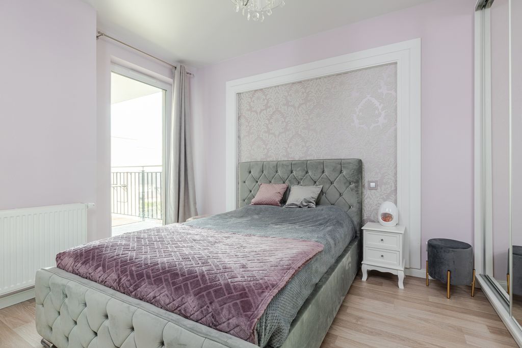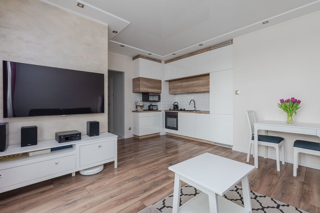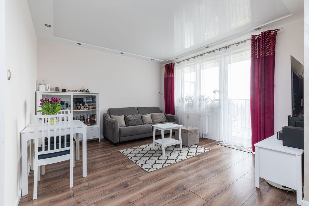 Mieszkanie wykończone jest w wysokim standardzie, nie wymaga nawet odświeżenia, nadaje się do wprowadzenia. Na podłodze w salonie i sypialni panele bardzo dobrej jakości, w przedpokoju i łazience gres. W mieszkaniu zamontowano sufity napinane z podświetleniem ledowym, które dają korzystny efekt wizualny i dodatkowo podwyższają optycznie mieszkanie. Lokal jest bardzo cichy i widny, okna w salonie wychodzą na stronę południową, a w sypialni na południowo wschodnią. Z obydwu pomieszczeń można wyjść na spory balkon o powierzchni 5,29mkw.