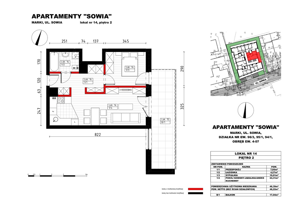 o pow. 46,39 m2 z ogromnym balkonem (17,04 m2) zlokalizowanego w bloku w