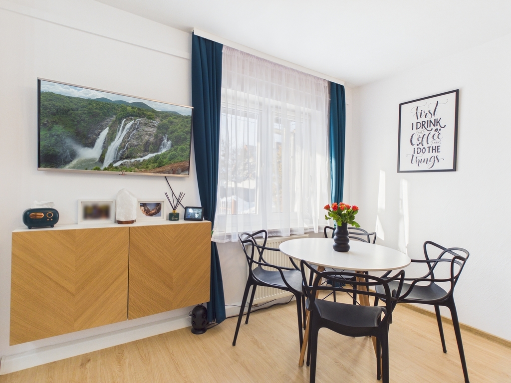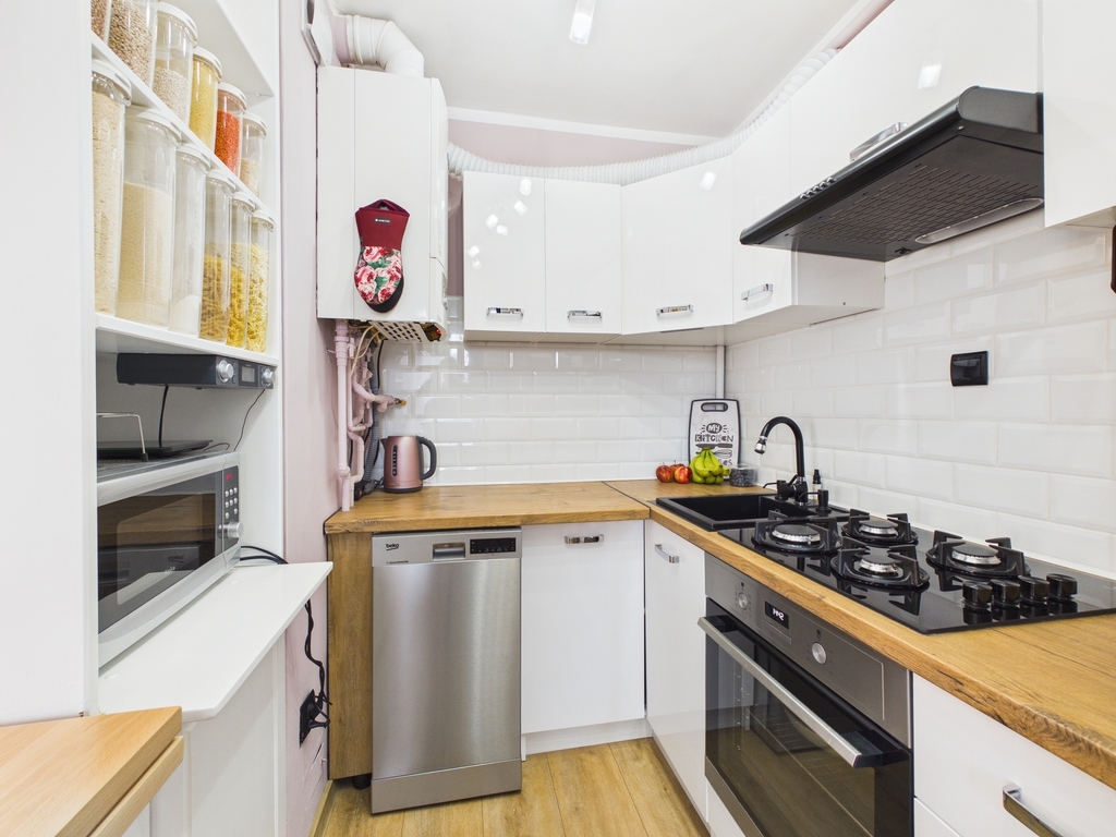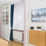 Mieszkanie jest odnowione, wyposażone w sprzęt RTV i AGD (m.in. telewizor, zmywaka, lodówka, pralka).