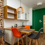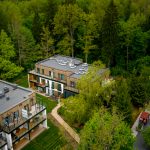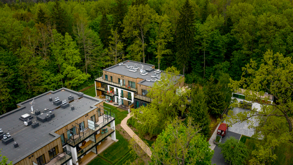 Nowoczesny, nieszablonowy charakter apartamentu podkreślają duże przeszklenia (na wysokość pomieszczenia) co zapewnia znakomite światło i piękne widoki na Puszczę.