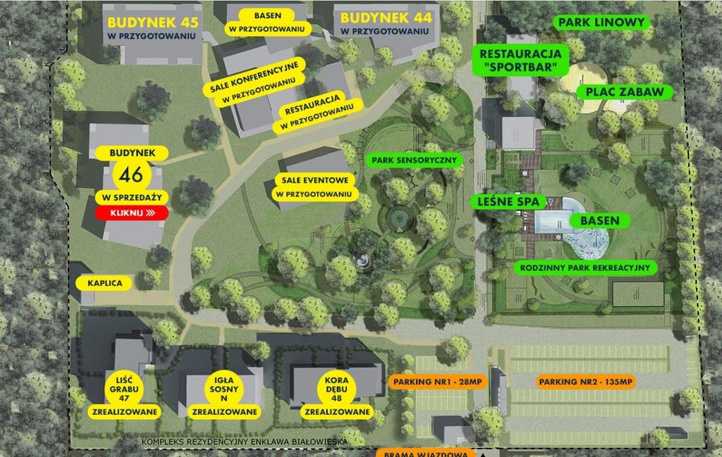 Lokalizacja:W ramach Enklawy, na powierzchni ponad 4 ha zapewniona jest bogata oferta infrastruktury i usług z zakresu sportu i rekreacji, m.in.: park linowy, plac zabaw, biobasen (część pływacka i brodzik dla dzieci), sauna fińska, bania i jaccuzi, boiska sportowe do gry w siatkówkę plażową i piłkę nożną, park sensoryczny, wypożyczalnia rowerów, wypożyczalnia sprzętu sportowego (ping-pong, bilard pod chmurką, badmington) / możliwość nieodpłatnego korzystania przy podpisanej umowie z operatorem /