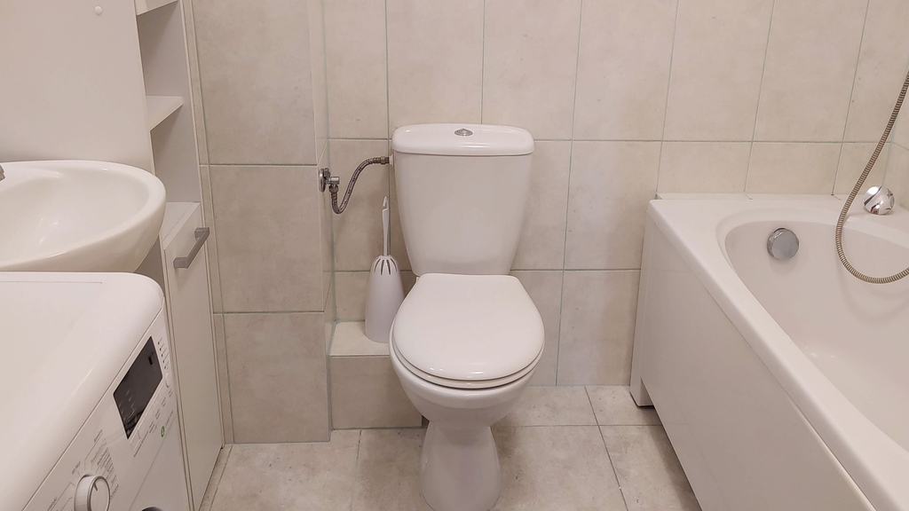 Łazienka wyposażona jest w pralkę oraz wannę.