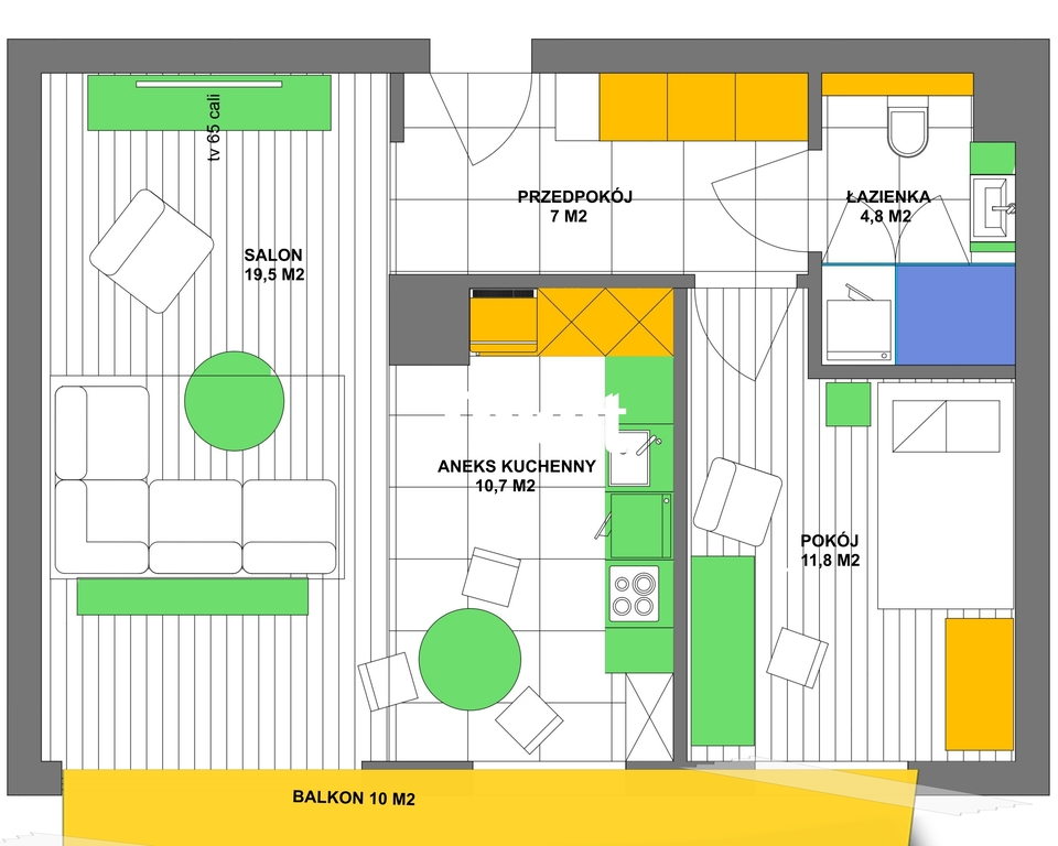 - salon - 19,5m2 z wyjściem na duży balkon (10 m2)