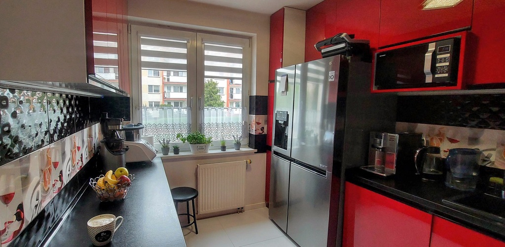 Kuchnia z nowoczesną stałą zabudową posiada kompletny sprzęt AGD.