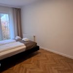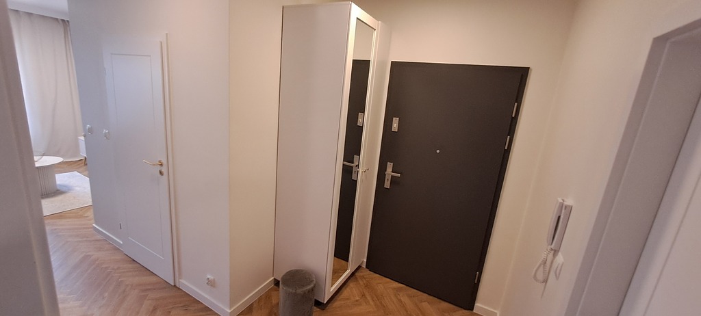 Wysoki standard wykończenia: drewniana podłoga w jodełkę, złote dodatki, jasna kolorystyka.