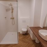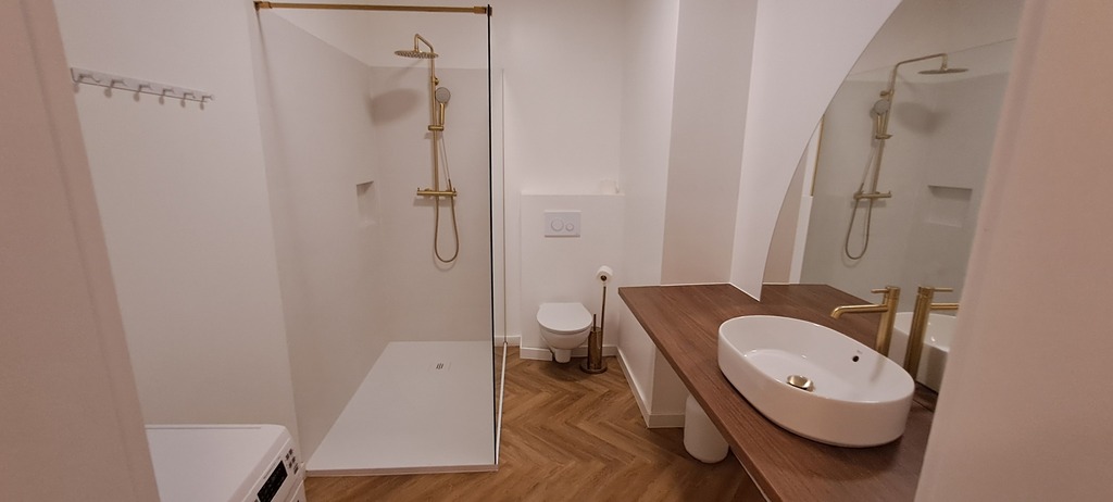 Elegancka, z prysznicem typu walk-in, armaturą w kolorze złotym i nowoczesną umywalką nablatową.