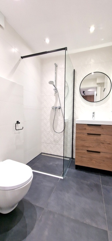 Łazienka – elegancka i nowoczesna, z brodzikiem oraz odpływem liniowym, zapewniającym wygodę użytkowania.