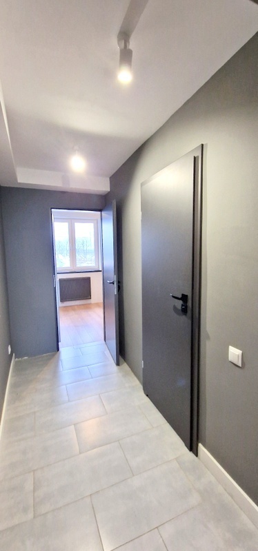 Układ pomieszczeń: Korytarz prowadzi do sypialni, łazienki oraz przestronnego aneksu kuchennego połączonego z salonem.