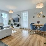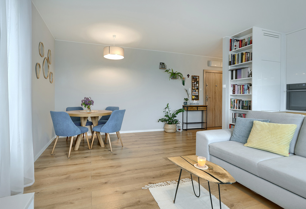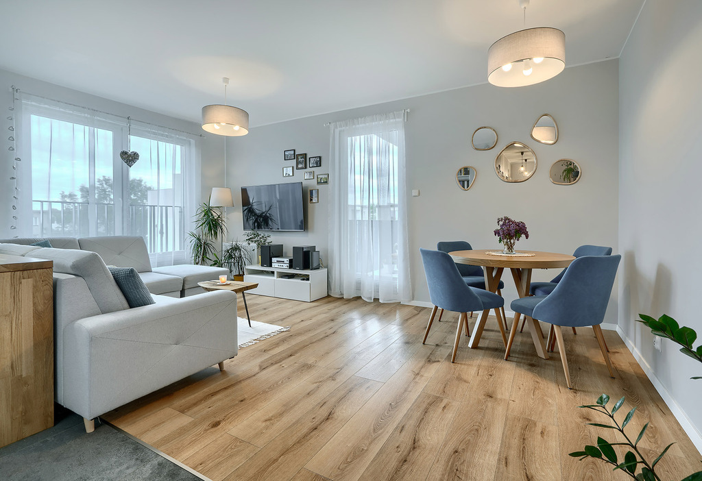 • Przestronny salon z aneksem kuchennym i wyjściem na loggię (28 m² + 8,5 m²)