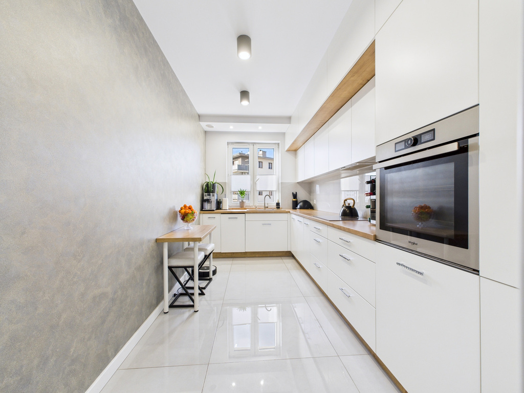 •  Oddzielna, jasna kuchnia w pełnej zabudowie, z piekarnikiem, płytą, zmywarką i lodówką
