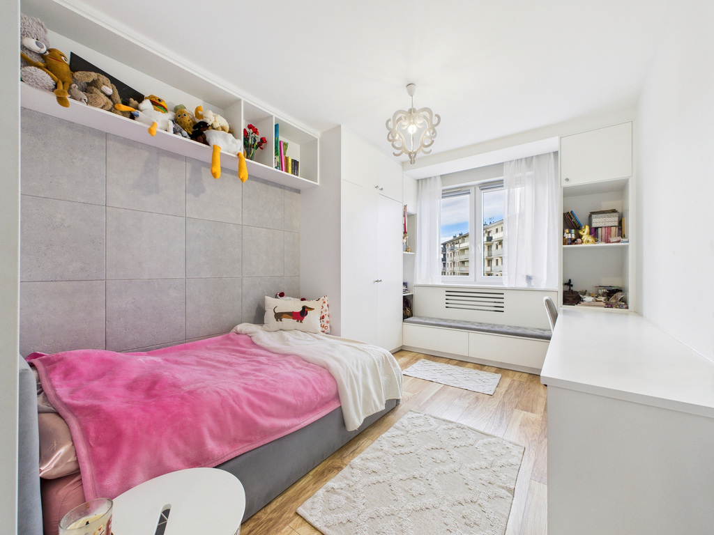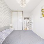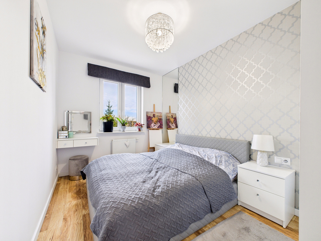 Dwie sypialnie – główna z dużym łóżkiem i zabudową, druga obecnie jako pokój dziecka (może pełnić funkcję gabinetu lub pokoju gościnnego)