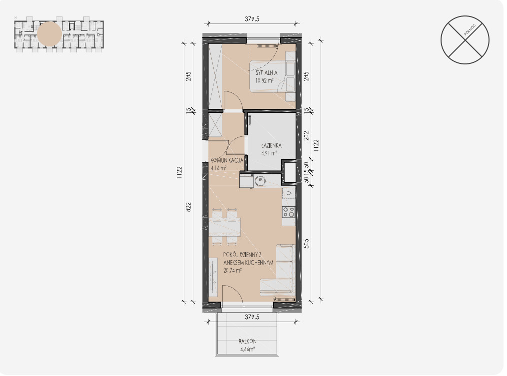 Apartament o powierzchni 40,63 m2 składa się z ;