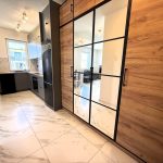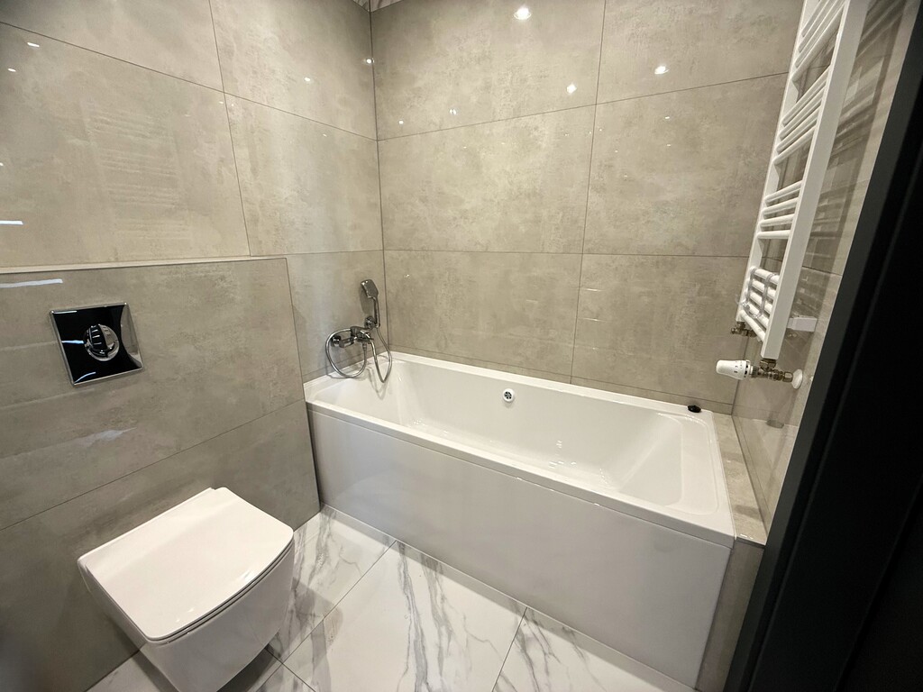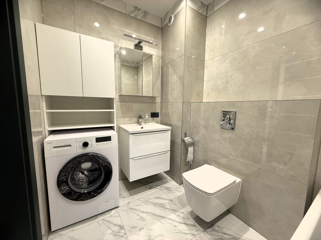 - Łazienka – wykończona w wysokim standardzie, wyposażona w armaturę sanitarną oraz pralkę.
